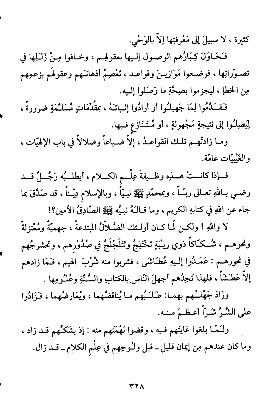 فإذا كانت هذه وظيفة علم الكلام، أيطلبه رجل قد رضي بالله تعالى ربا، وبمحمد صلى الله عليه وسلم نبيا، وبالإسلام دينا، قد صدق بما جاء عن الله في كتابه الكريم، وما قاله نبيه صلى الله عليه وسلم الصادق الأمين؟