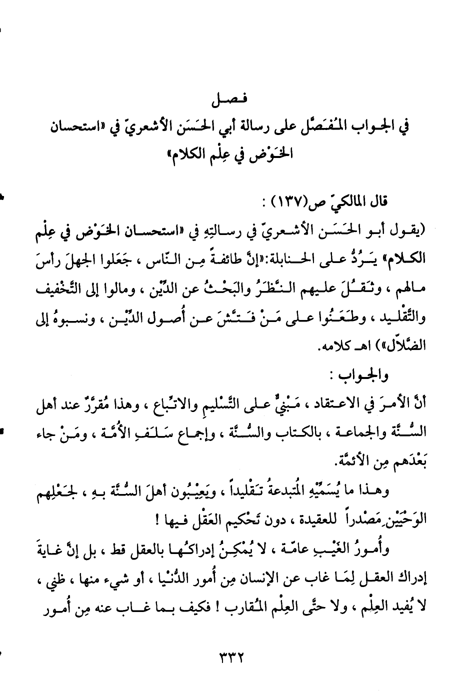 " استحسان الخوض في علم الكلام " قال المالكي ص (137) : (يقول أبو الحسن الأشعري في رسالته في " استحسان الخوض في علم الكلام " يرد على الحنابلة: " إن طائفة من الناس جعلوا الجهل رأس مالهم، وثقل عليهم النظر والبحث عن الدين، ومالوا إلى التخفيف والتقليد، وطعنوا على من فتش عن أصول الدين، ونسبوه إلى الضلال ") اهـ كلامه.