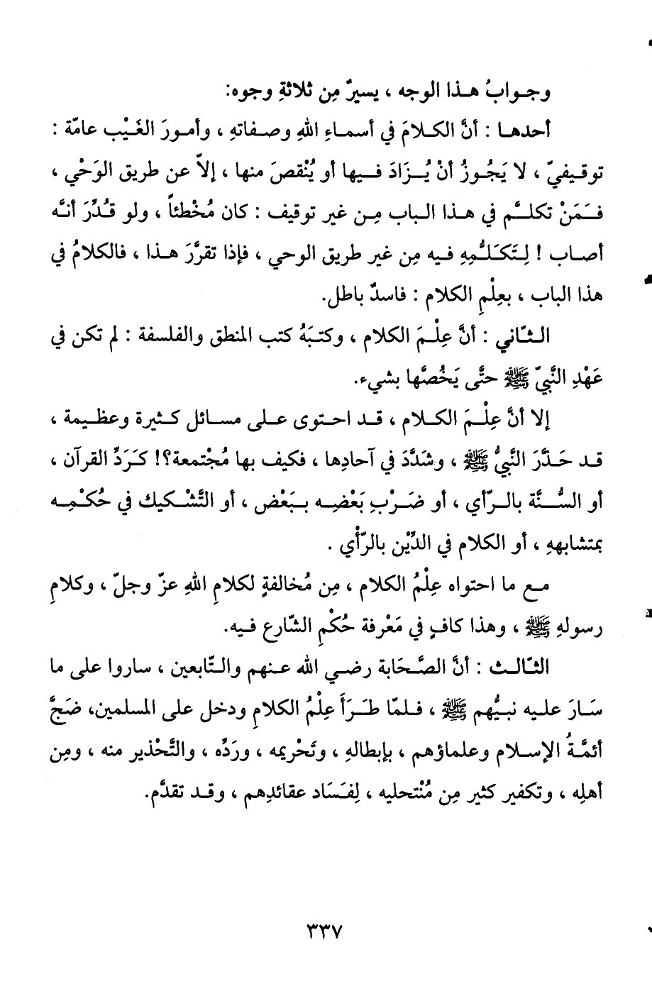 وجواب هذا الوجه يسير من ثلاثة وجوه: أحدها: أن الكلام في أسماء الله وصفاته وأمور الغيب عامة توقيفي، لا يجوز أن يزاد فيها أو ينقص منها إلا عن طريق الوحي، فمن تكلم في هذا الباب من غير توقيف كان مخطئا، ولو قدر أنه أصاب؛ لتكلمه فيه من غير طريق الوحي، فإذا تقرر هذا فالكلام في هذا الباب بعلم الكلام فاسد باطل.