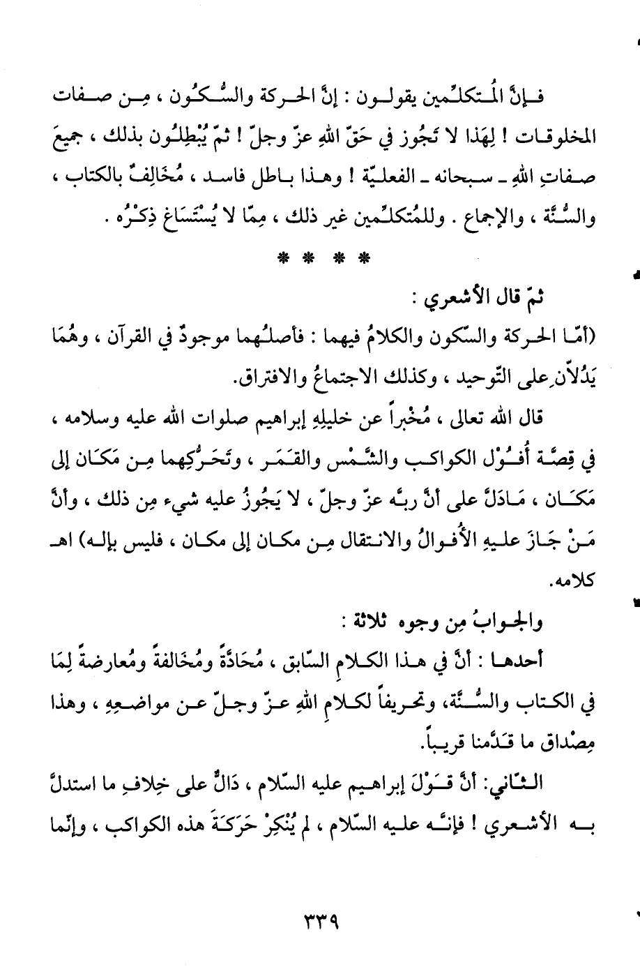 ثم قال الأشعري: (أما الحركة والسكون والكلام فيهما فأصلهما موجود في القرآن، وهما يدلان على التوحيد، وكذلك الاجتماع والافتراق، قال الله تعالى، مخبرا عن خليله إبراهيم صلوات الله عليه وسلامه، في قصة أفول الكواكب والشمس والقمر، وتحركهما من مكان إلى مكان، ما دل على أن ربه عز وجل، لا يجوز عليه شيء من ذلك، وأن من جاز عليه الأفول والانتقال من مكان إلى مكان فليس بإله) اهـ كلامه.