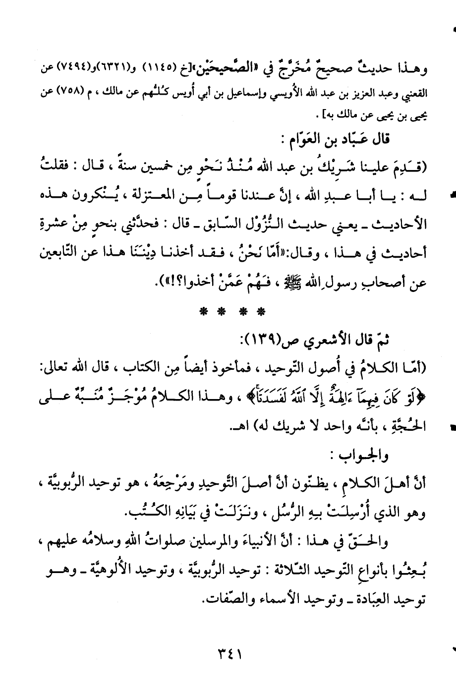 ثم قال الأشعري ص (139) : (أما الكلام في أصول التوحيد فمأخوذ أيضا من الكتاب، قال الله تعالى: {لَوْ كَانَ فِيهِمَا آلِهَةٌ إِلَّا اللَّهُ لَفَسَدَتَا} [الأنبياء: 22] ، وهذا الكلام موجز منبه على الحجة، بأنه واحد لا شريك له) اهـ.
