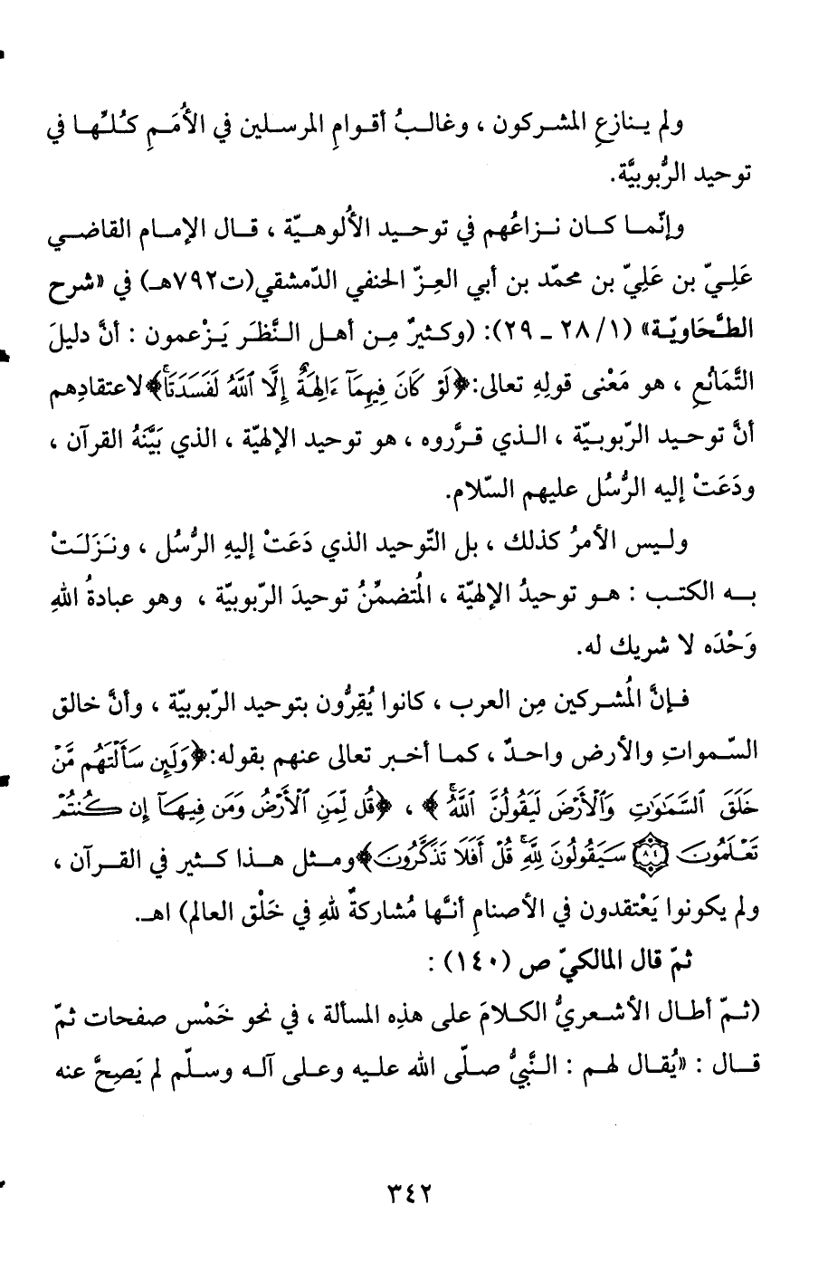 ولم ينازع المشركون وغالب أقوام المرسلين في الأمم كلها في توحيد الربوبية، وإنما كان نزاعهم في توحيد الألوهية، قال الإمام القاضي علي بن علي بن محمد بن أبي العز الحنفي الدمشقي (ت 792 هـ) في " شرح الطحاوية " (1 / 28- 29) : (وكثير من أهل النظر يزعمون أن دليل التمانع هو معنى قوله تعالى: {لَوْ كَانَ فِيهِمَا آلِهَةٌ إِلَّا اللَّهُ لَفَسَدَتَا} [الأنبياء: 22] لاعتقادهم أن توحيد الربوبية، الذي قرروه هو توحيد الألوهية الذي بينه القرآن، ودعت إليه الرسل عليهم السلام.