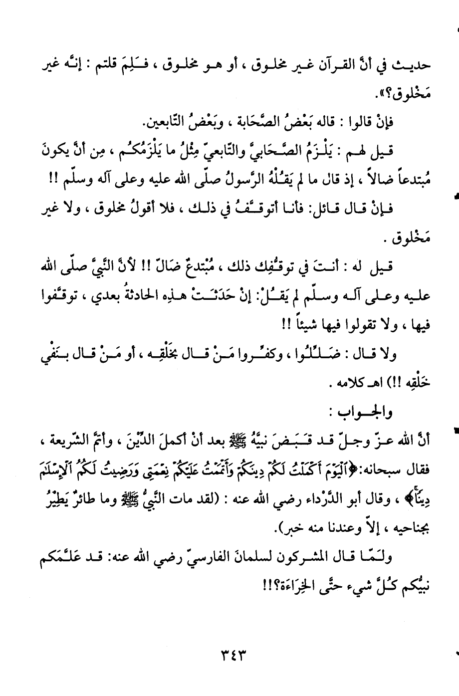 حديث في أن القرآن غير مخلوق، أو هو مخلوق، فلم قلتم إنه غير مخلوق؟ ".