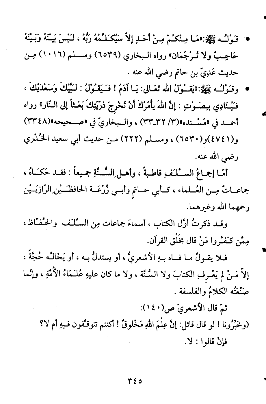 * قوله صلى الله عليه وسلم: «ما منكم من أحد إلا سيكلمه ربه، ليس بينه وبينه حاجب ولا ترجمان» ، رواه البخاري (6539) ومسلم (1016) من حديث عدي بن حاتم رضي الله عنه.