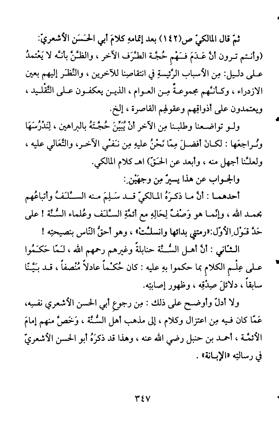 ثم قال المالكي ص (142) بعد إتمامه كلام أبي الحسن الأشعري: (وأنتم ترون أن عدم فهم حجة الطرف الآخر، والظن بأنه لا يعتمد على دليل، من الأسباب الرئيسة في انتقاصنا للآخرين، والنظر إليهم بعين الازدراء، وكأنهم مجموعة من العوام الذين يعكفون على التقليد، ويعتمدون على أذواقهم وعقولهم القاصرة، إلخ.