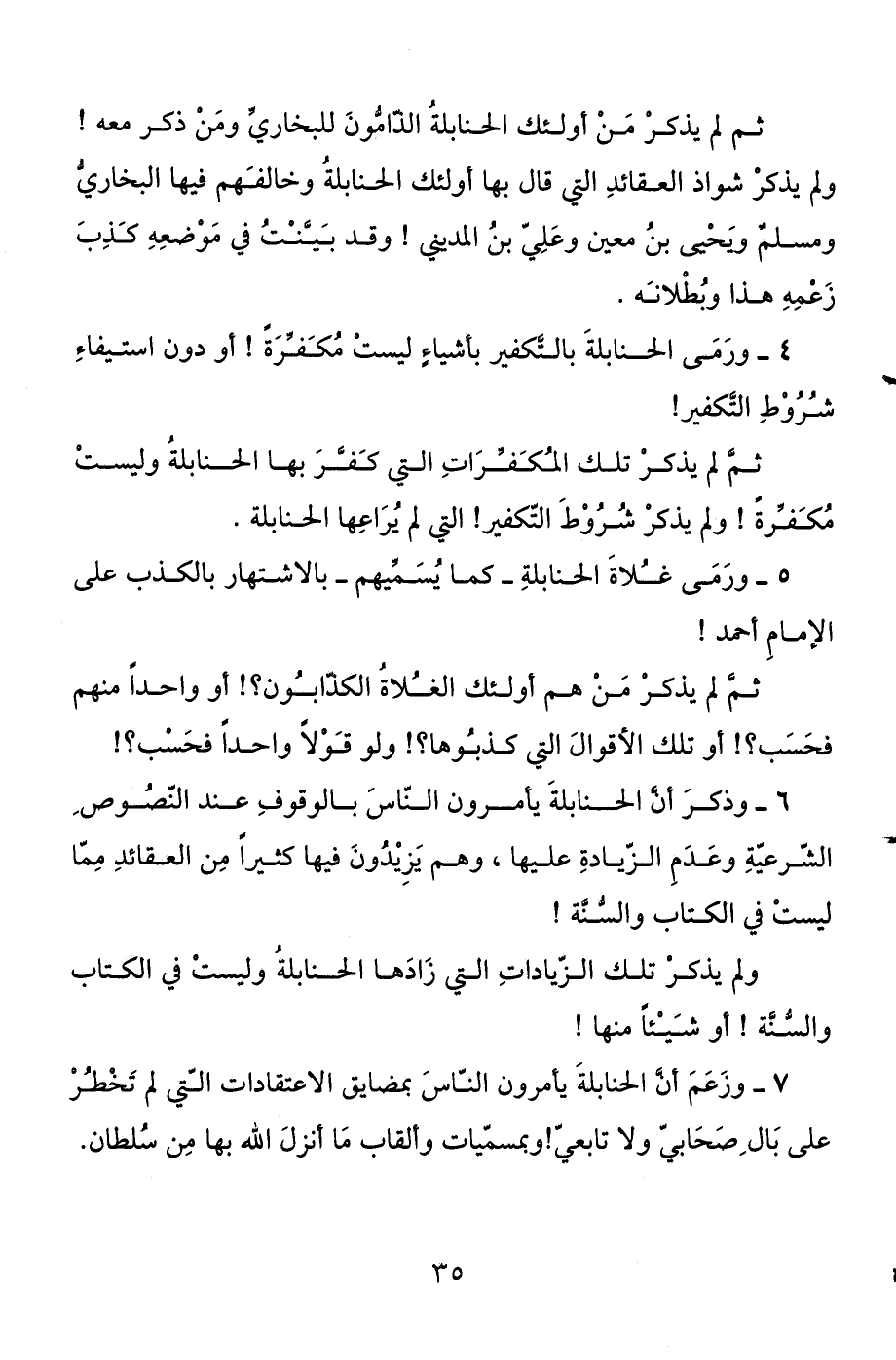 7 - وزعم أن الحنابلة يأمرون الناس بمضايق الاعتقادات التي لم تخطر على بال صحابي ولا تابعي! وبمسميات وألقاب ما أنزل الله بها من سلطان.