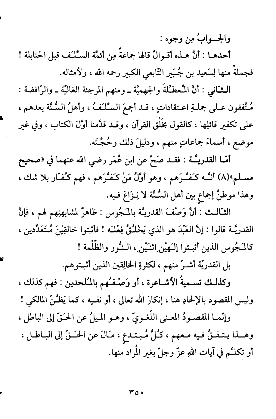 أما القدرية فقد صح عن ابن عمر رضي الله عنهما في " صحيح مسلم " (8) أنه كفرهم، وهو أول من كفرهم، فهم كفار بلا شك، وهذا موطن إجماع بين أهل السنة لا نزاع فيه.