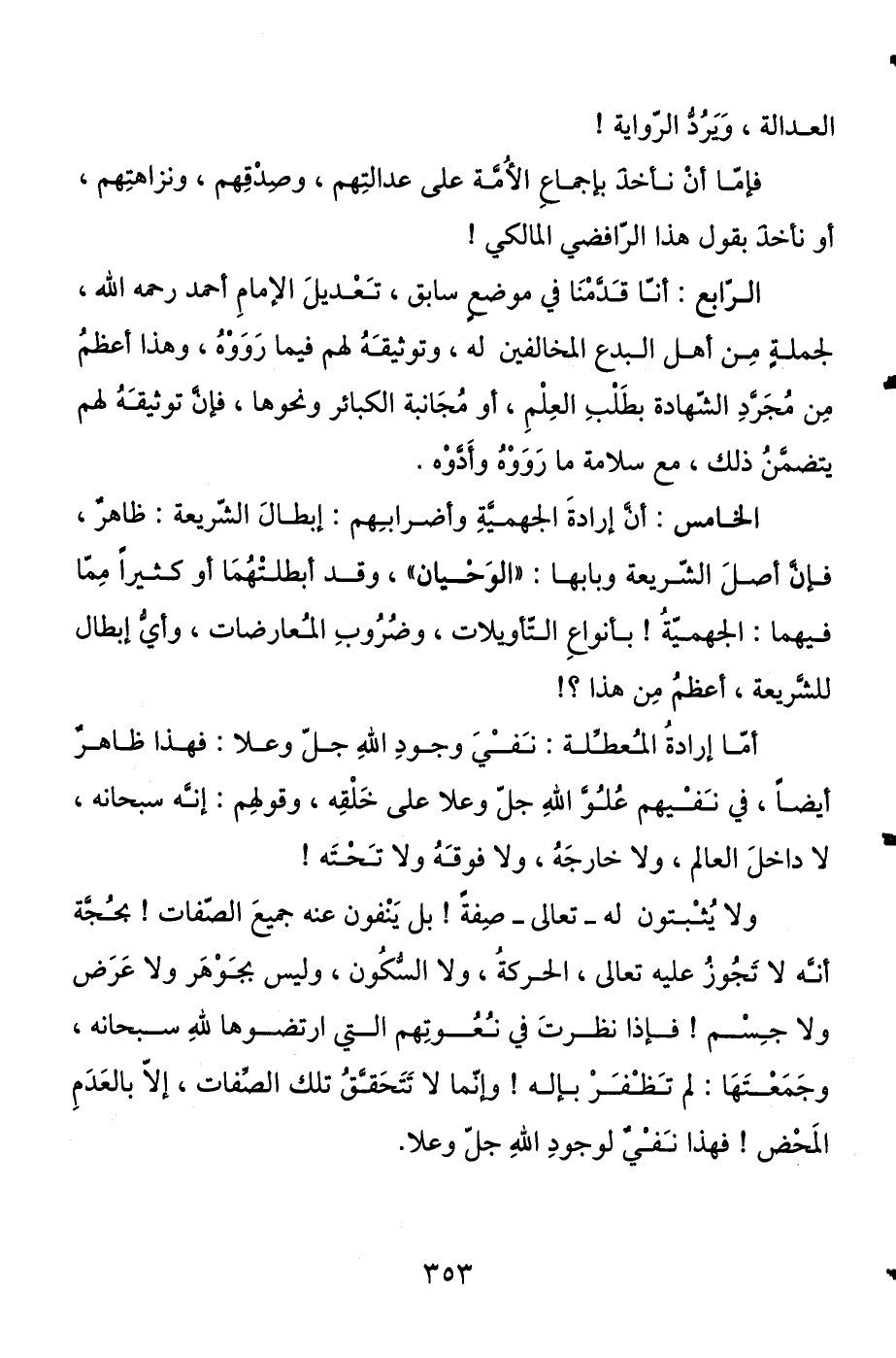 الخامس: أن إرادة الجهمية وأضرابهم إبطال الشريعة ظاهر، فإن أصل الشريعة وبابها " الوحيان "، وقد أبطلتهما أو كثيرا مما فيهما الجهمية بأنواع التأويلات، وضروب المعارضات، وأي إبطال للشريعة أعظم من هذا؟