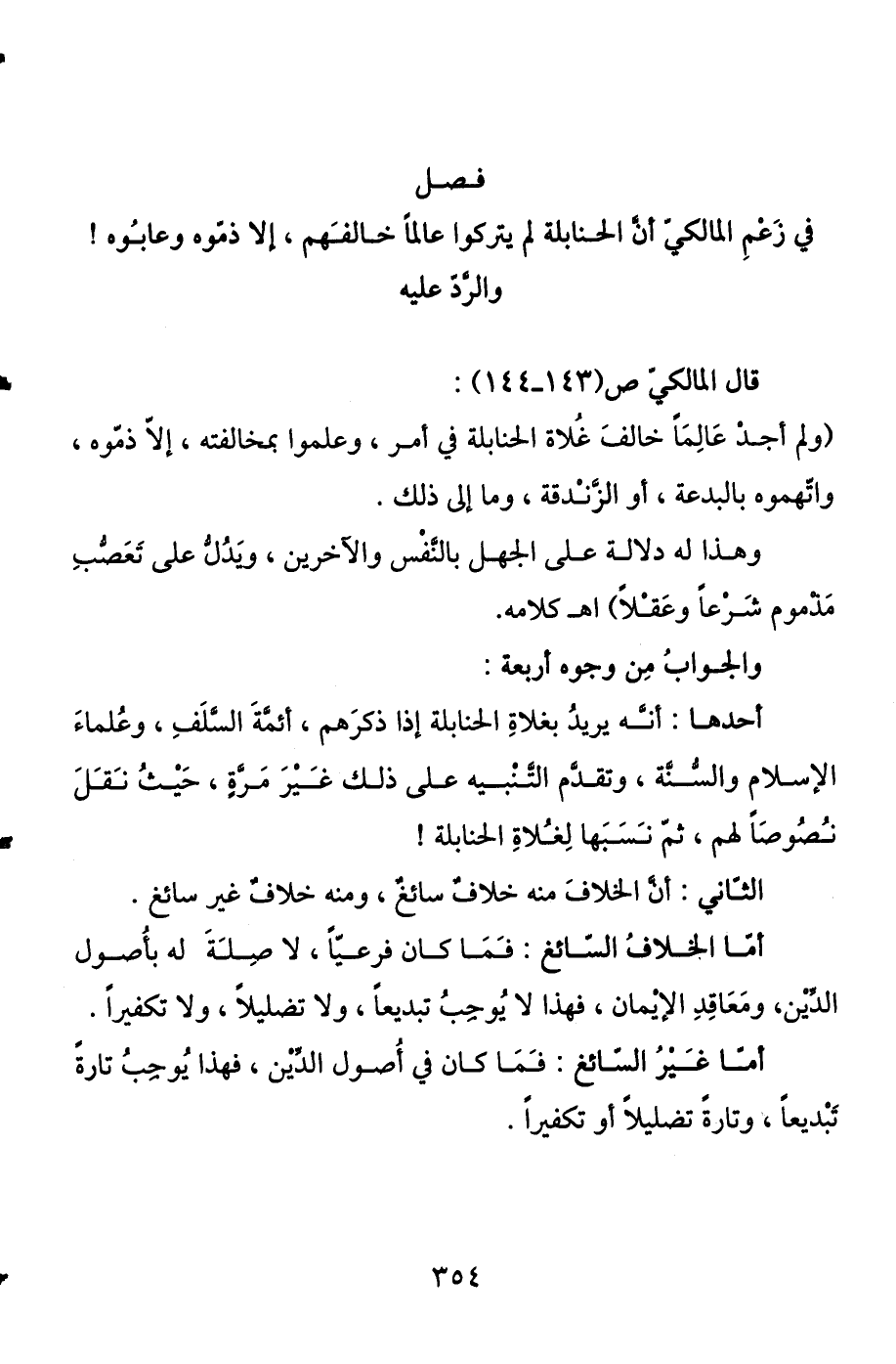 والرد عليه قال المالكي ص (143 - 144) : (ولم أجد عالما خالف غلاة الحنابلة في أمر وعلموا بمخالفته إلا ذموه، واتهموه بالبدعة أو الزندقة، وما إلى ذلك، وهذا له دلالة على الجهل بالنفس والآخرين، ويدل على تعصب مذموم شرعا وعقلا) اهـ كلامه.