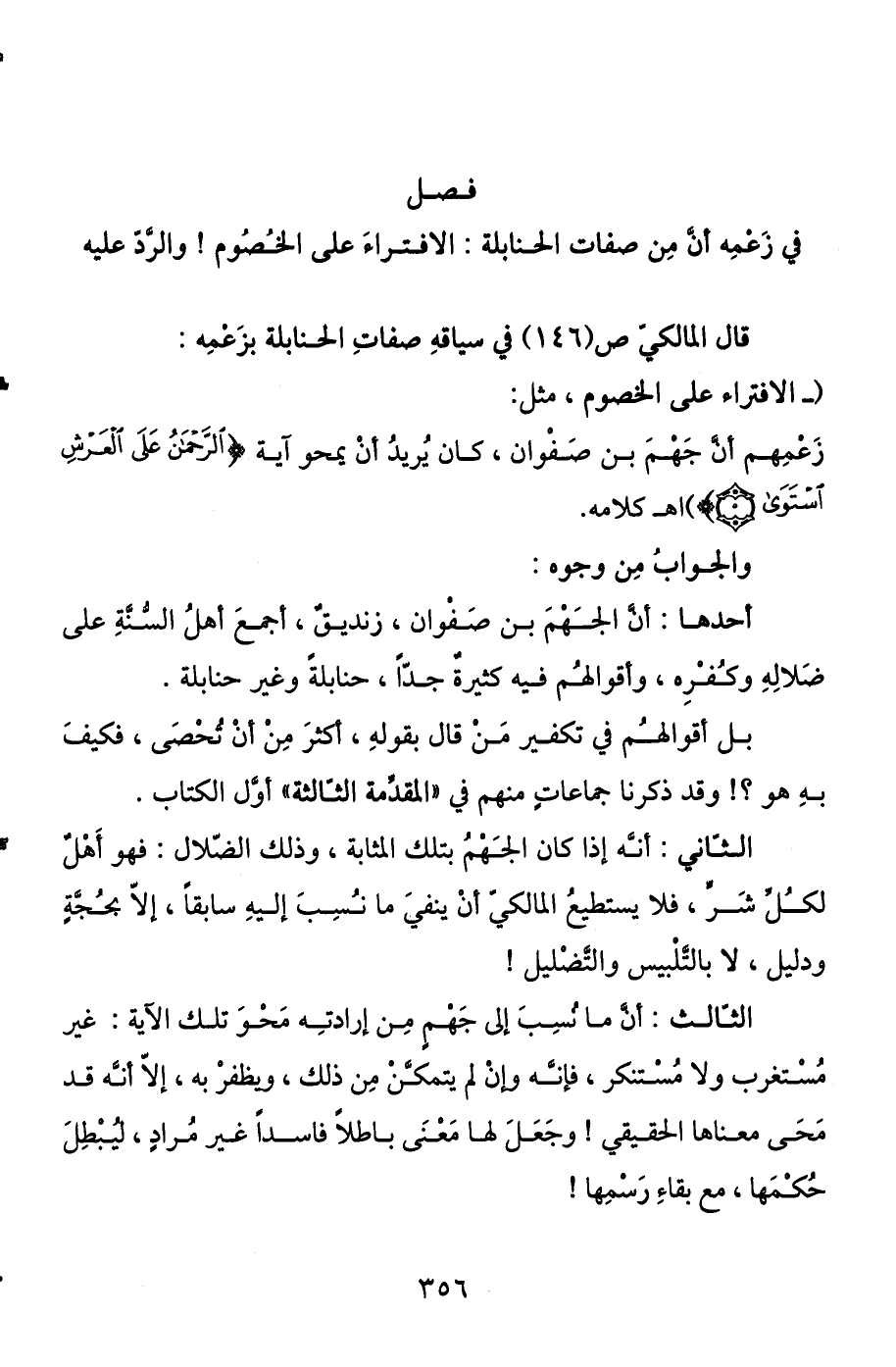 في زعمه أن من صفات الحنابلة الافتراء على الخصوم، والرد عليه قال المالكي ص (146) في سياقه صفات الحنابلة بزعمه: (- الافتراء على الخصوم، مثل زعمهم أن جهم بن صفوان كان يريد أن يمحو آية {الرَّحْمَنُ عَلَى الْعَرْشِ اسْتَوَى} [طه: 5] ) اهـ كلامه.