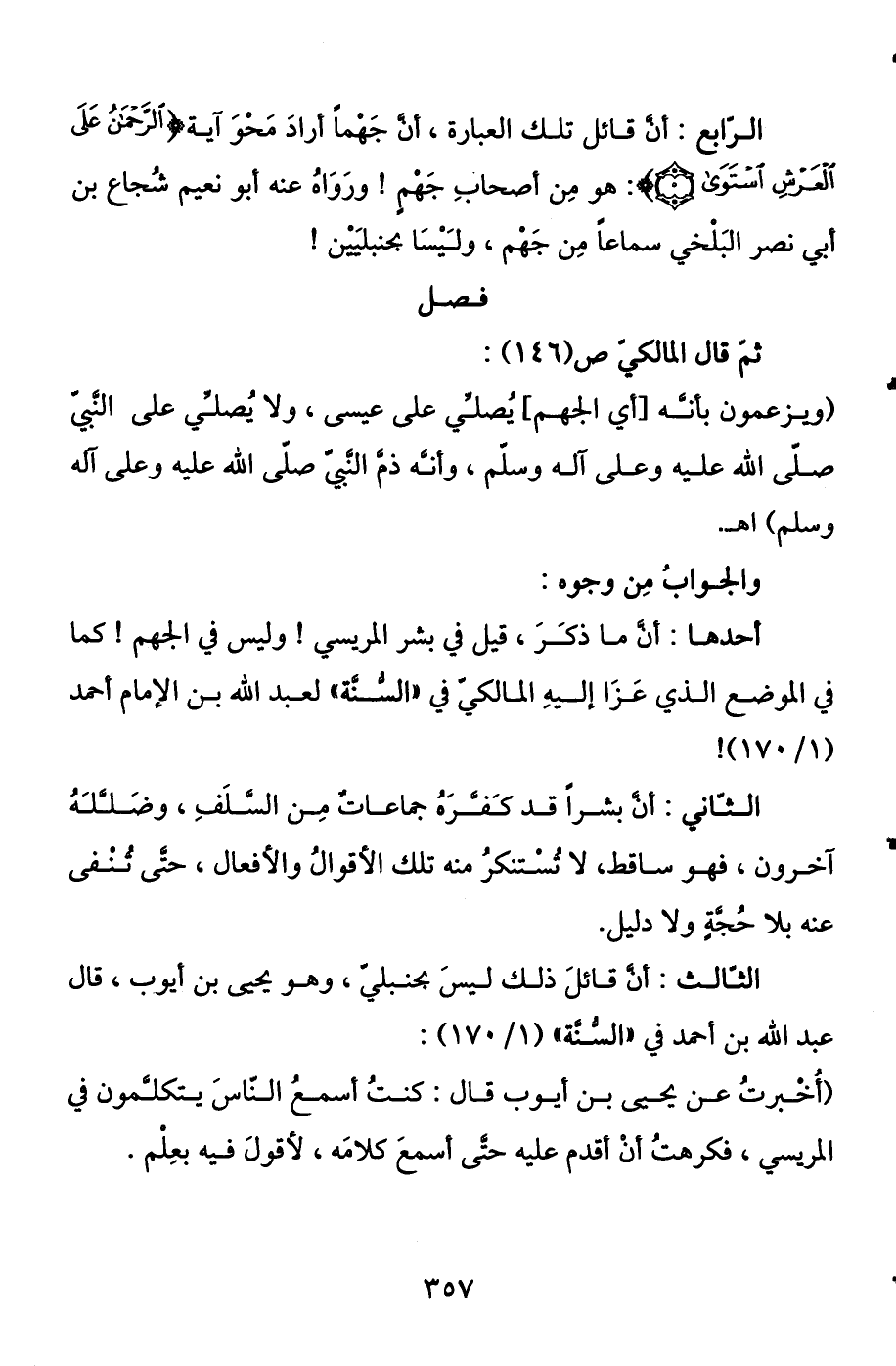 فصل ثم قال المالكي ص (146) : (ويزعمون بأنه [أي الجهم] يصلي على عيسى، ولا يصلي على النبي صلى الله عليه وعلى آله وسلم، وأنه ذم النبي صلى الله عليه وعلى آله وسلم) اهـ.
