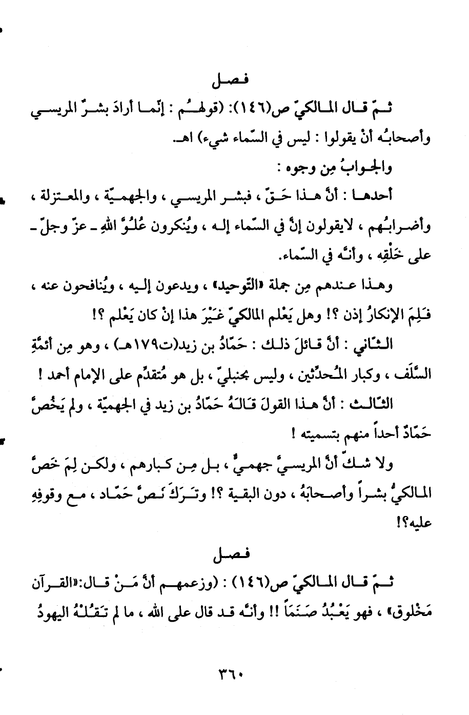 فصل ثم قال المالكي ص (146) : (قولهم: إنما أراد بشر المريسي وأصحابه أن يقولوا: ليس في السماء شيء) اهـ.
