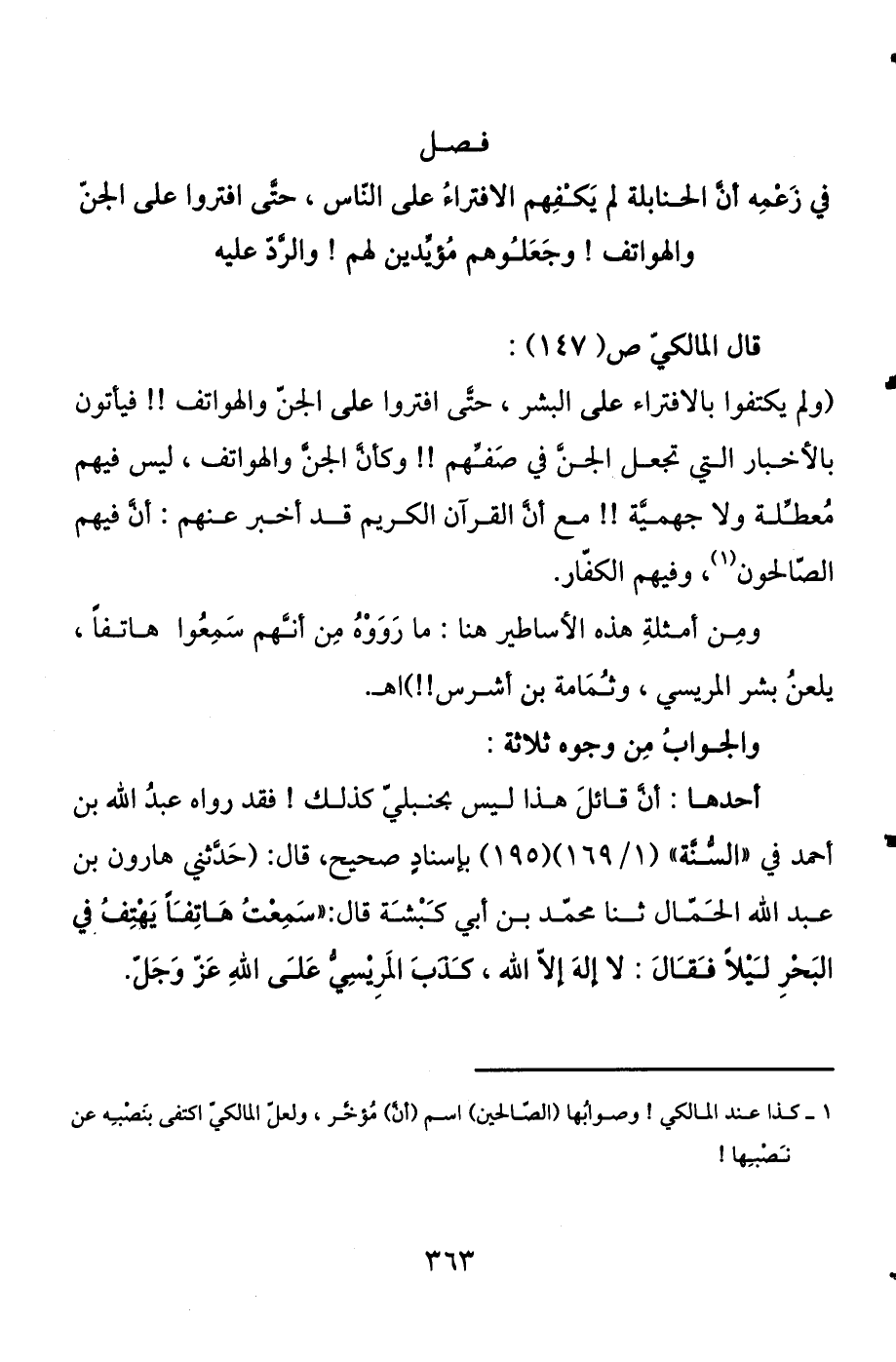 والهواتف، وجعلوهم مؤيدين لهم، والرد عليه قال المالكي ص (147) : (ولم يكتفوا بالافتراء على البشر، حتى افتروا على الجن والهواتف، فيأتون بالأخبار التي تجعل الجن في صفهم، وكأن الجن والهواتف ليس فيهم معطلة ولا جهمية، مع أن القرآن الكريم قد أخبر عنهم أن فيهم الصالحون (¬1) وفيهم الكفار.
