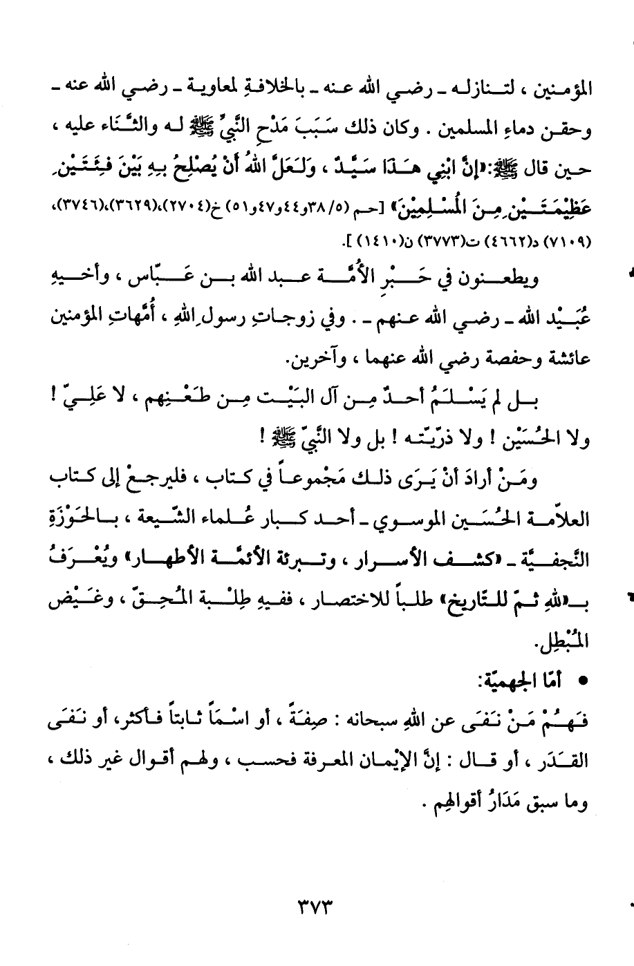المؤمنين لتنازله - رضي الله عنه - بالخلافة لمعاوية - رضي الله عنه - وحقن دماء المسلمين، وكان ذلك سبب مدح النبي صلى الله عليه وسلم والثناء عليه حين قال صلى الله عليه وسلم: «إن ابني هذا سيد، ولعل الله أن يصلح به بين فئتين عظيمتين من المسلمين» [حم (5 / 38 و 44 و 47 و51) خ (2704) ، (3629) ، (3746) د (4662) ت (3773) ن (1410) ] .