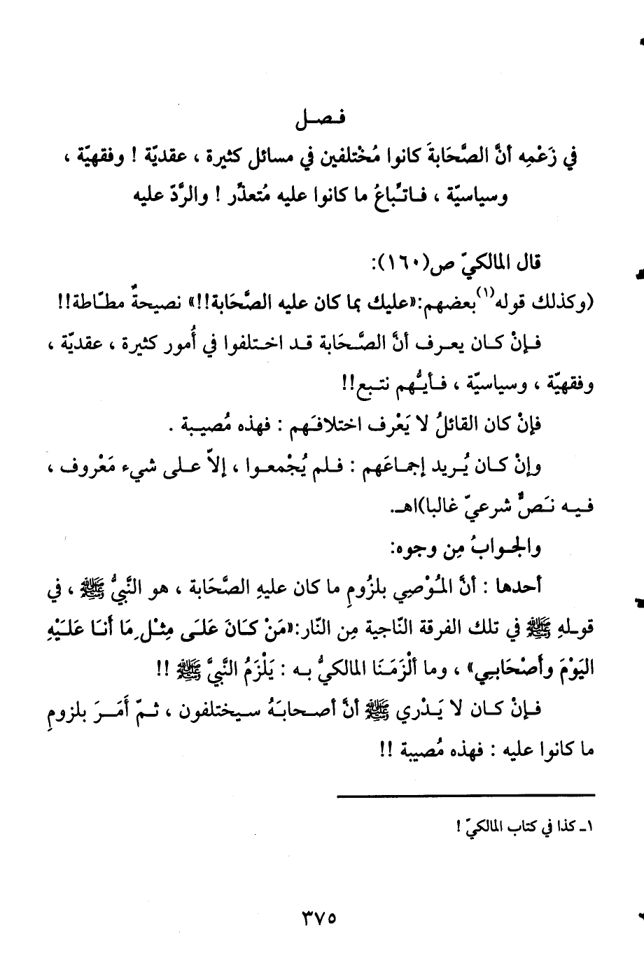 والجواب من وجوه: أحدها: أن الموصي بلزوم ما كان عليه الصحابة هو النبي صلى الله عليه وسلم في قوله صلى الله عليه وسلم في تلك الفرقة الناجية من النار: «من كان على مثل ما أنا عليه اليوم وأصحابي» ، وما ألزمنا المالكي به يلزم النبي صلى الله عليه وسلم، فإن كان لا يدري صلى الله عليه وسلم أن أصحابه سيختلفون، ثم أمر بلزوم ما كانوا عليه فهذه مصيبة.