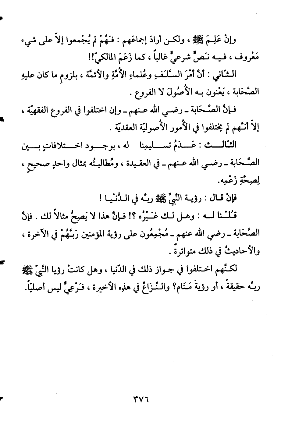 فإن قال: رؤية النبي صلى الله عليه وسلم ربه في الدنيا، قلنا له: وهل لك غيره؟ فإن هذا لا يصح مثالا لك، فإن الصحابة - رضي الله عنهم - مجمعون على رؤية المؤمنين ربهم في الآخرة، والأحاديث في ذلك متواترة، لكنهم اختلفوا في جواز ذلك في الدنيا، وهل كانت رؤيا النبي صلى الله عليه وسلم ربه حقيقة أو رؤية منام؟ والنزاع في هذه الأخيرة فرعي ليس أصليا.