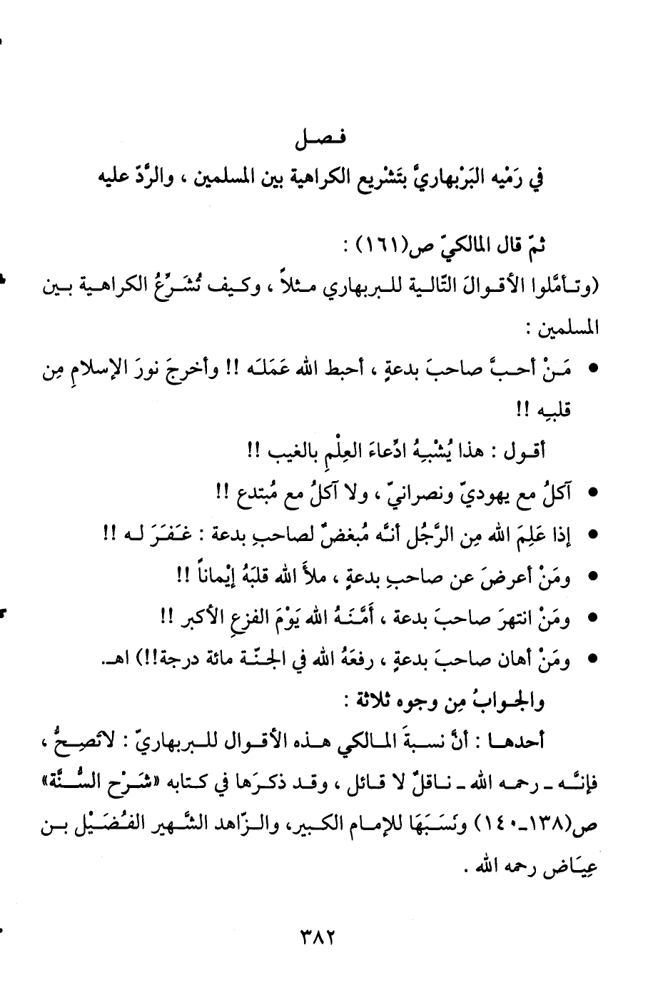 في رميه البربهاري بتشريع الكراهية بين المسلمين، والرد عليه ثم قال المالكي ص (161) : (وتأملوا الأقوال التالية للبربهاري مثلا، وكيف تشرع الكراهية بين المسلمين: