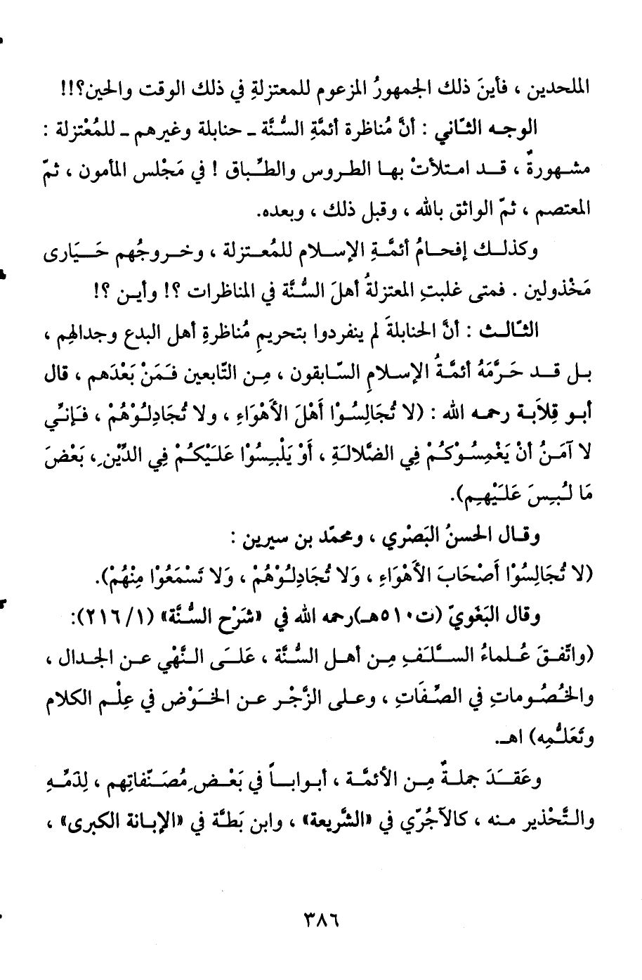 الوجه الثاني: أن مناظرة أئمة السنة - حنابلة وغيرهم - للمعتزلة مشهورة، قد امتلأت بها الطروس والطباق في مجلس المأمون، ثم المعتصم، ثم الواثق بالله، وقبل ذلك وبعده.