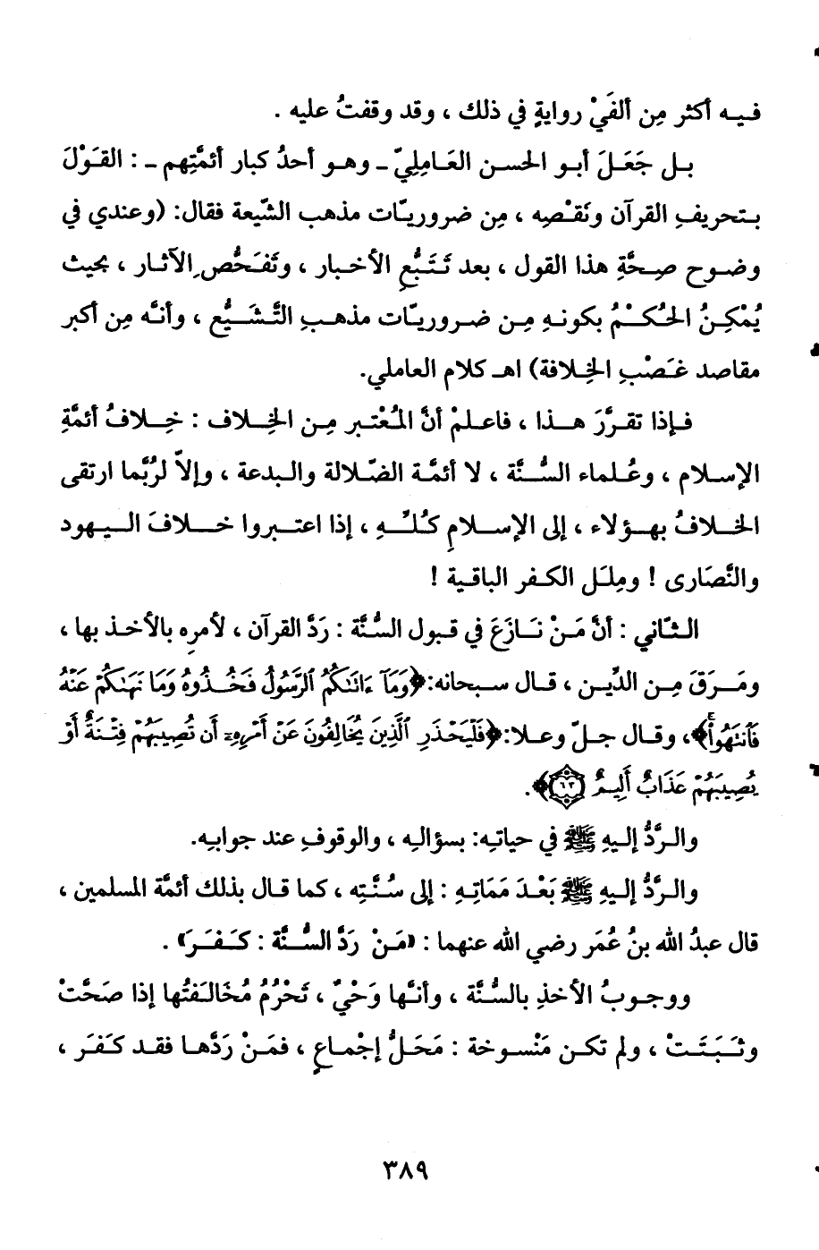 بل جعل أبو الحسن العاملي - وهو أحد كبار أئمتهم - القول بتحريف القرآن ونقصه من ضروريات مذهب الشيعة، فقال: (وعندي في وضوح صحة هذا القول بعد تتبع الأخبار، وتفحص الآثار، بحيث يمكن الحكم بكونه من ضروريات مذهب التشيع، وأنه من أكبر مقاصد غصب الخلافة) اهـ كلام العاملي.