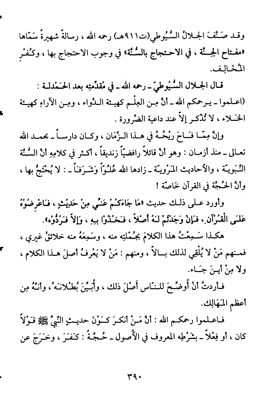 وقد صنف الجلال السيوطي (ت 911 هـ) رحمه الله رسالة شهيرة سماها " مفتاح الجنة في الاحتجاج بالسنة " في وجوب الاحتجاج بها وكفر المخالف، قال الجلال السيوطي - رحمه الله - في مقدمته بعد الحمدلة: (اعلموا - يرحمكم الله - أن من العلم كهيئة الدواء، ومن الآراء كهيئة الخلاء، لا تذكر إلا عند داعية الضرورة، وإن مما فاح ريحه في هذا الزمان، وكان دارسا - بحمد الله تعالى - منذ أزمان، وهو أن قائلا رافضيا زنديقا أكثر في كلامه أن السنة النبوية والأحاديث المروية - زادها الله علوا وشرفا - لا يحتج بها، وأن الحجة في القرآن خاصة.