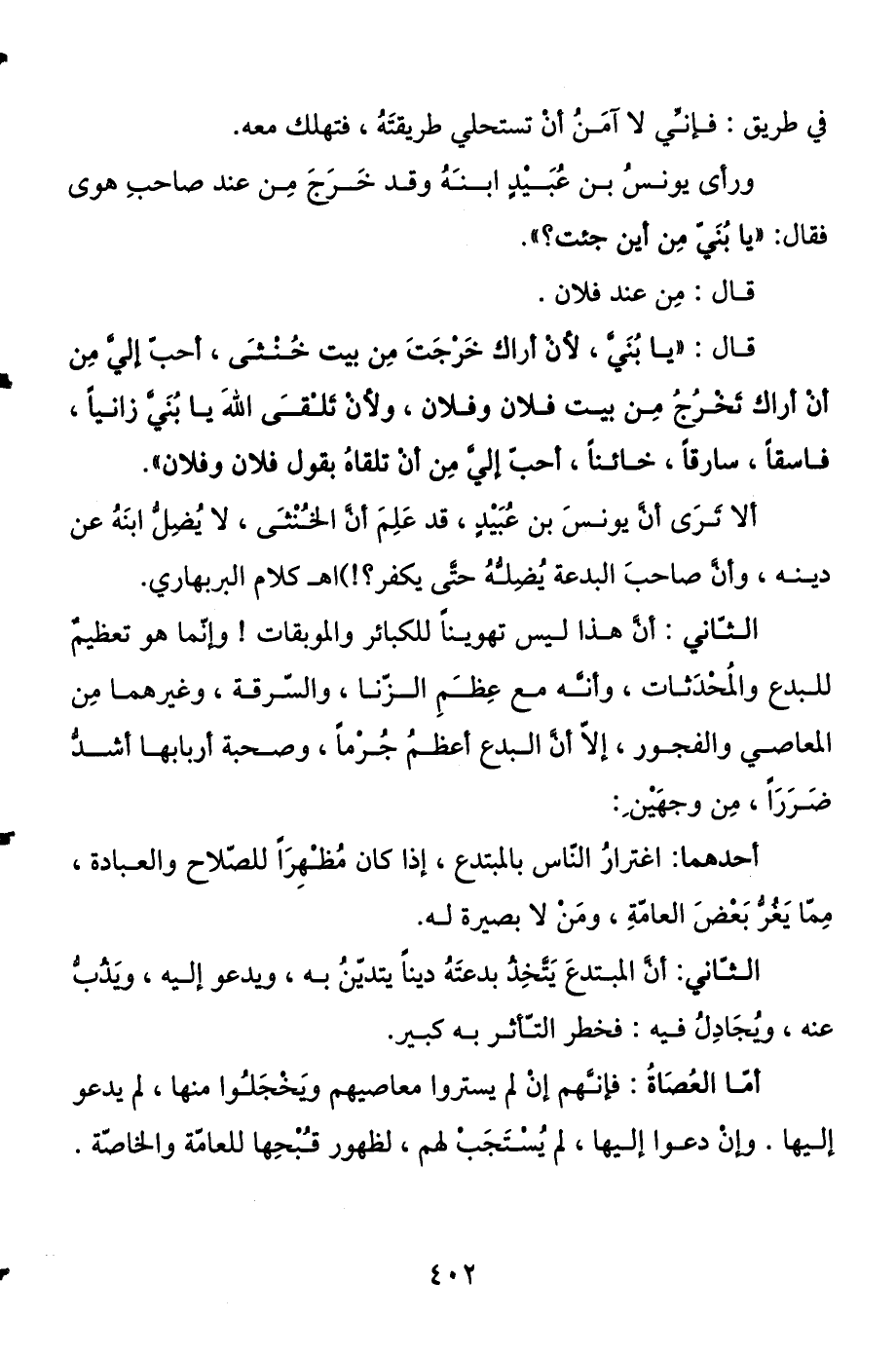 ألا ترى أن يونس بن عبيد قد علم أن الخنثى لا يضل ابنه عن دينه، وإلى صاحب البدعة يضله حتى يكفر؟) اهـ كلام البربهاري.