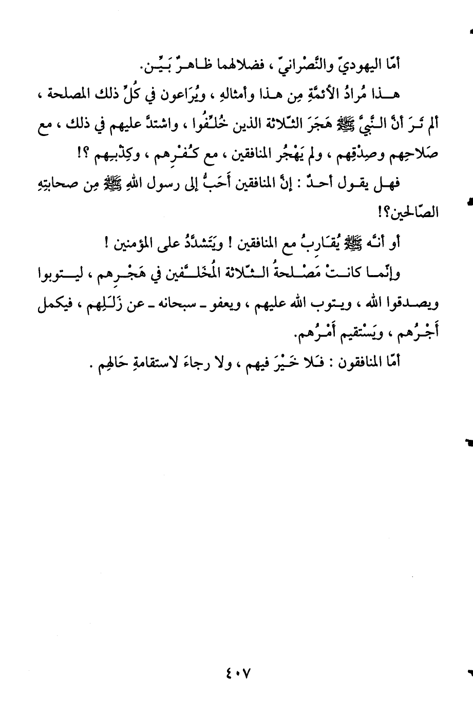 وإنما كانت مصلحة الثلاثة المخلفين في هجرهم؛ ليتوبوا ويصدقوا الله، ويتوب الله عليهم، ويعفو - سبحانه - عن زللهم، فيكمل أجرهم، ويستقيم أمرهم، أما المنافقون فلا خير فيهم، ولا رجاء لاستقامة حالهم.
