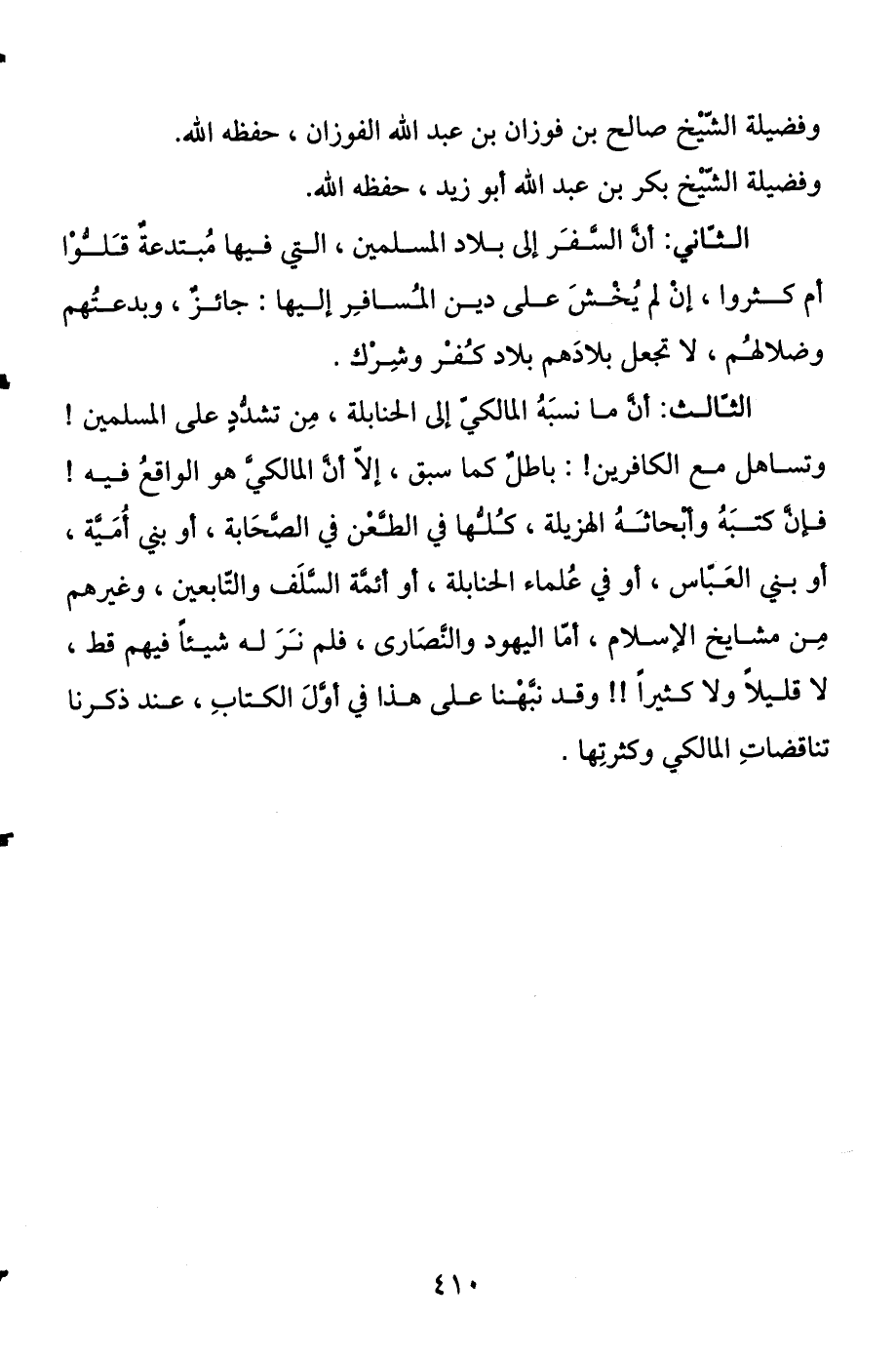 الثالث: أن ما نسبه المالكي إلى الحنابلة من تشدد على المسلمين، وتساهل مع الكافرين، باطل كما سبق، إلا أن المالكي هو الواقع فيه، فإن كتبه وأبحاثه الهزيلة كلها في الطعن في الصحابة، أو بني أمية، أو بني العباس، أو في علماء الحنابلة، أو أئمة السلف والتابعين، وغيرهم من مشايخ الإسلام، أما اليهود والنصارى فلم نر له شيئا فيهم قط، لا قليلا ولا كثيرا، وقد نبهنا على هذا في أول الكتاب عند ذكرنا تناقضات المالكي وكثرتها.