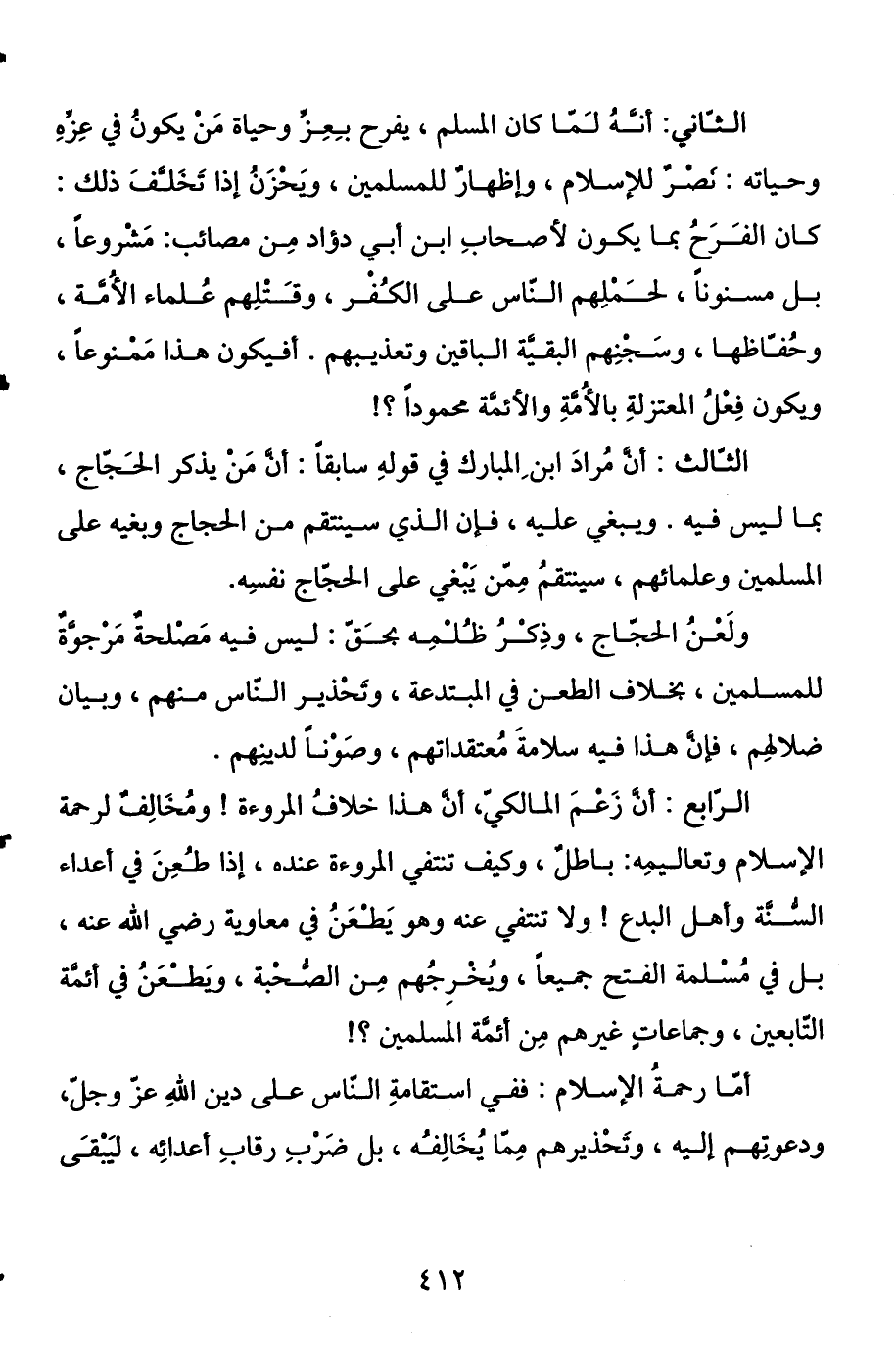 الرابع: أن زعم المالكي أن هذا خلاف المروءة ومخالف لرحمة الإسلام وتعاليمه باطل، وكيف تنتفي المروءة عنده إذا طعن في أعداء السنة وأهل البدع، ولا تنتفي عنه وهو يطعن في معاوية رضي الله عنه، بل في مسلمة الفتح جميعا، ويخرجهم من الصحبة، ويطعن في أئمة التابعين، وجماعات غيرهم من أئمة المسلمين؟