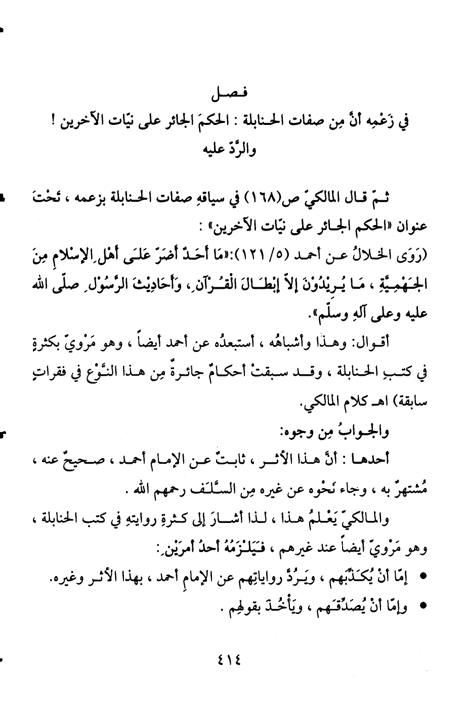 والرد عليه ثم قال المالكي ص (168) في سياقه صفات الحنابلة بزعمه، تحت عنوان " الحكم الجائر على نيات الآخرين ": (روى الخلال عن أحمد (5 / 121) : " ما أحد أضر على أهل الإسلام من الجهمية، ما يريدون إلا إبطال القرآن، وأحاديث الرسول صلى الله عليه وعلى آله وسلم ".