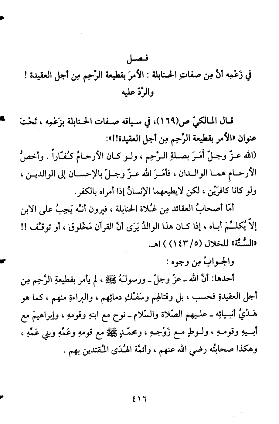 والرد عليه قال المالكي ص (169) في سياقه صفات الحنابلة بزعمه، تحت عنوان " الأمر بقطيعة الرحم من أجل العقيدة ": (الله عز وجل أمر بصلة الرحم، ولو كان الأرحام كفارا، وأخص الأرحام هما الوالدان، فأمر الله عز وجل بالإحسان إلى الوالدين ولو كانا كافرين، لكن لا يطيعهما الإنسان إذا أمراه بالكفر، أما أصحاب العقائد من غلاة الحنابلة فيرون أنه يجب على الابن ألا يكلم أباه إذا كان هذا الوالد يرى أن القرآن مخلوق، أو توقف " السنة " للخلال (5 / 143)) اهـ.