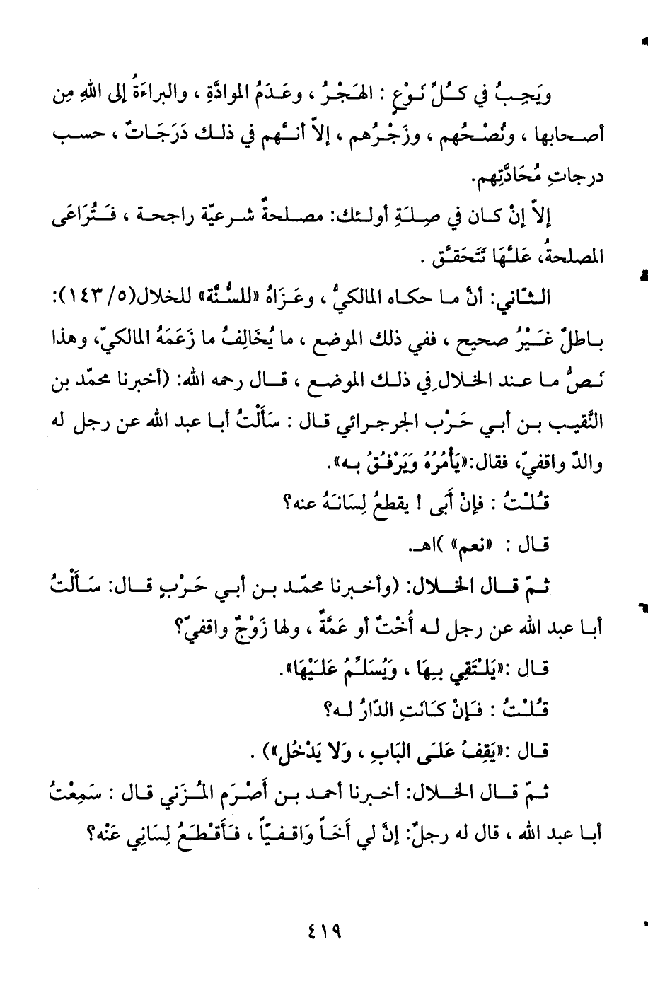الثاني: أن ما حكاه المالكي، وعزاه "للسنة" للخلال (5 / 143) : باطل غير صحيح، ففي ذلك الموضع، ما يخالف ما زعمه المالكي، وهذا نص ما عند الخلال في ذلك الموضع، قال رحمه الله: (أخبرنا محمد بن النقيب بن أبي حرب الجرجرائي قال: سألت أبا عبد الله عن رجل له والد واقفي، فقال: "يأمره ويرفق به ".