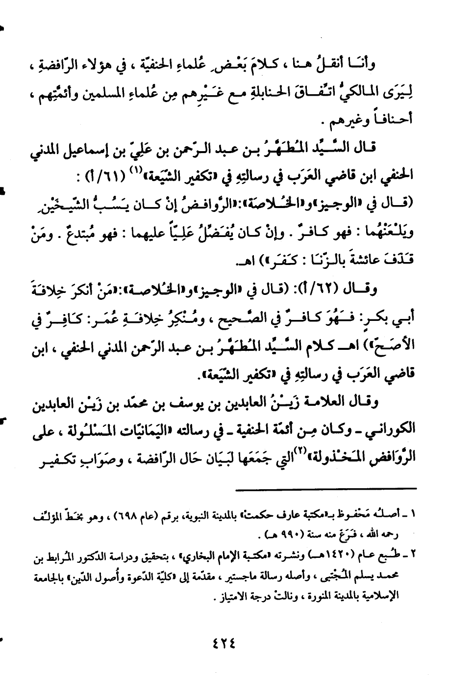 وقال (62 / أ) : (قال في "الوجيز" و"الخلاصة": "من أنكر خلافة أبي بكر: فهو كافر في الصحيح، ومنكر خلافة عمر: كافر في الأصح ") اهـ كلام السيد المطهر بن عبد الرحمن المدني الحنفي، ابن قاضي العرب في رسالته في "تكفير الشيعة".