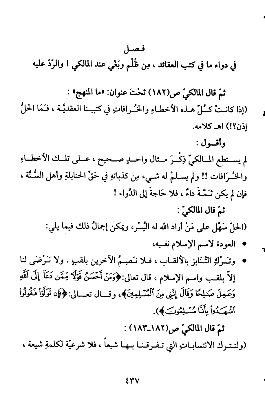 في دواء ما في كتب العقائد، من ظلم وبغي عند المالكي! والرد عليه ثم قال المالكي ص (182) تحت عنوان: "ما المنهج": (إذا كانت كل هذه الأخطاء والخرافات في كتبنا العقدية، فما الحل إذن؟!) اهـ كلامه.