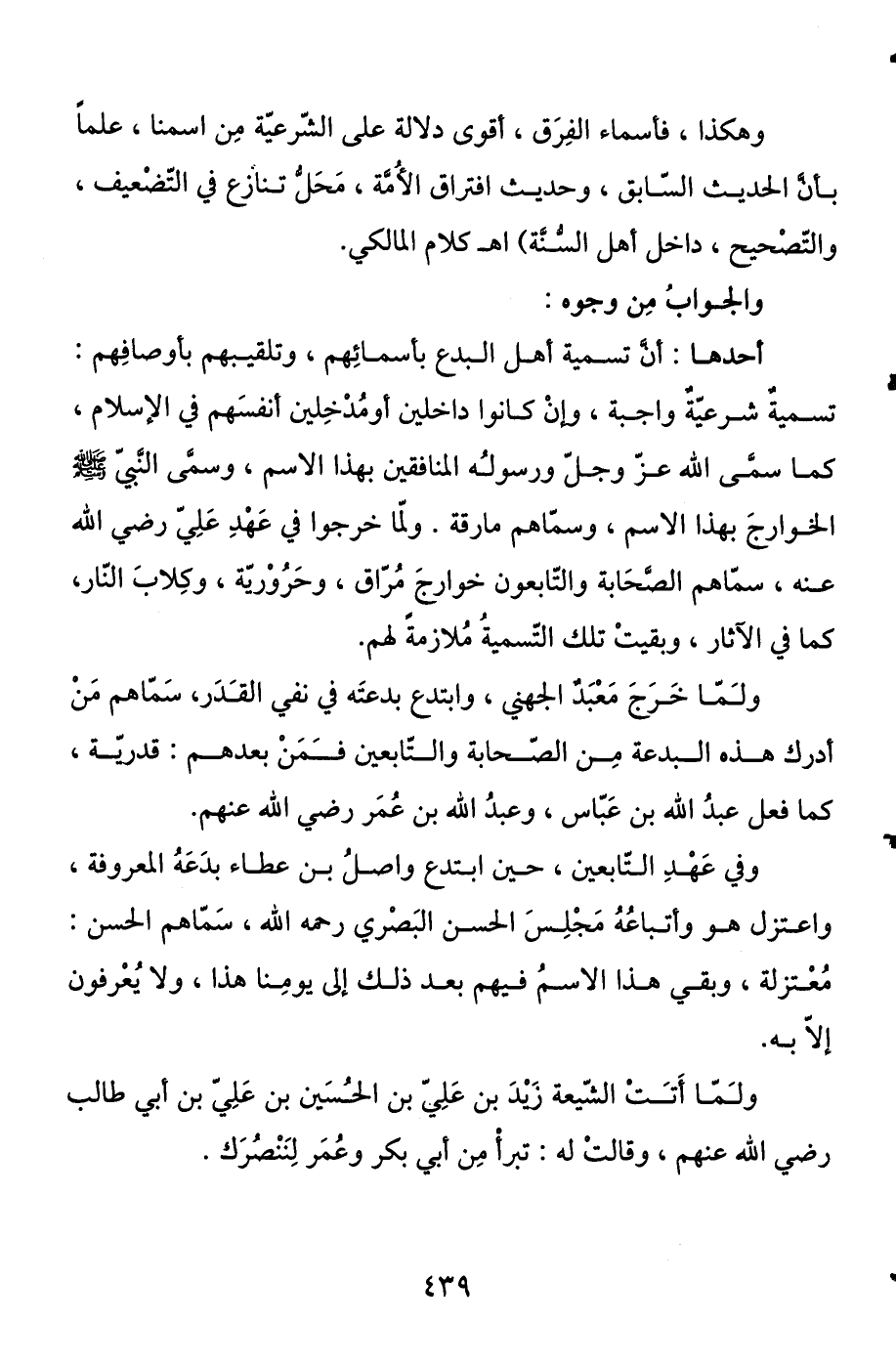 والجواب من وجوه: أحدها: أن تسمية أهل البدع بأسمائهم، وتلقيبهم بأوصافهم: تسمية شرعية واجبة، وإن كانوا داخلين أو مُدخلين أنفسهم في الإسلام، كما سمى الله عز وجل ورسوله المنافقين بهذا الاسم، وسمى النبي صلى الله عليه وسلم الخوارج بهذا الاسم، وسماهم مارقة. ولما خرجوا في عهد علي رضي الله عنه، سماهم الصحابة والتابعون خوارج مراق، وحرورية، وكلاب النار، كما في الآثار، وبقيت تلك التسمية ملازمة لهم.