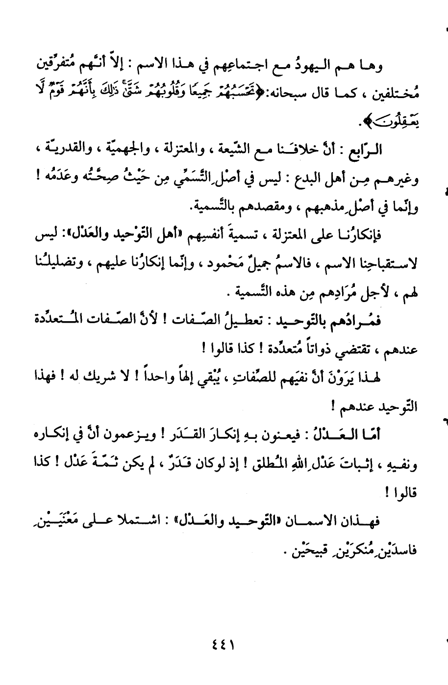 فهذان الاسمان (التوحيد والعدل: اشتملا على معنيين فاسدين منكرين قبيحين.