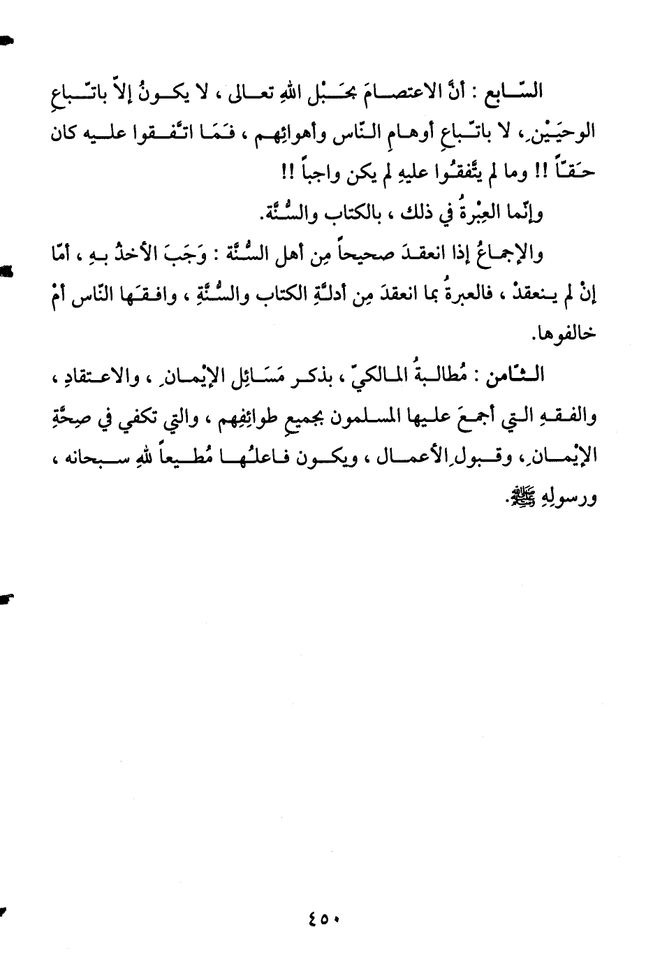 الثامن: مطالبة المالكي، بذكر مسائل الإيمان، والاعتقاد، والفقه التي أجمع عليها المسلمون بجميع طوائفهم، والتي تكفي في صحة الإيمان، وقبول الأعمال، ويكون فاعلها مطيعا لله سبحانه، ورسوله صلى الله عليه وسلم.