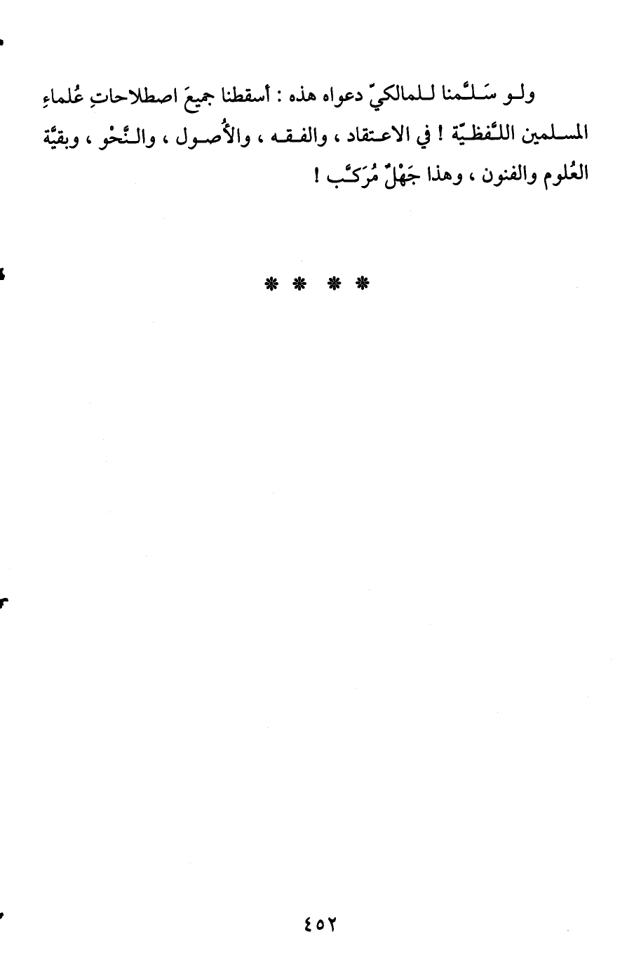 ولو سلمنا للمالكي دعْواه هذه: أسقطنا جميع اصطلاحات علماء المسلمين اللفظية! في الاعتقاد، والفقه، والأصول، والنحو، وبقية العلوم والفنون، وهذا جهل مركب!