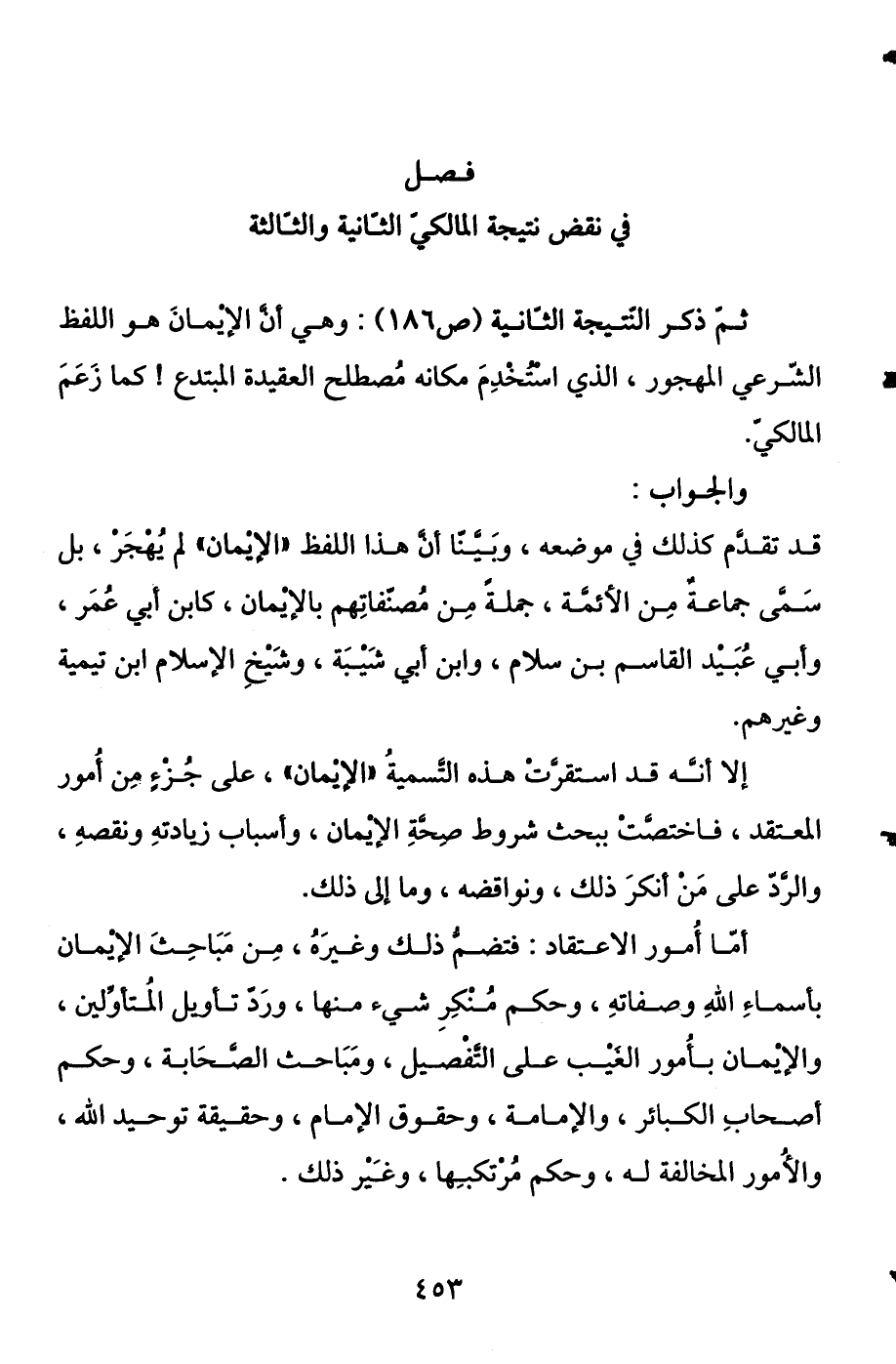 في نقض نتيجة المالكي الثانية والثالثة ثم ذكر النتيجة الثانية (ص186) : وهي أن الإيمان هو اللفظ الشرعي المهجور، الذي استخدم مكانه مصطلح العقيدة المبتدع! كما زعم المالكي.
