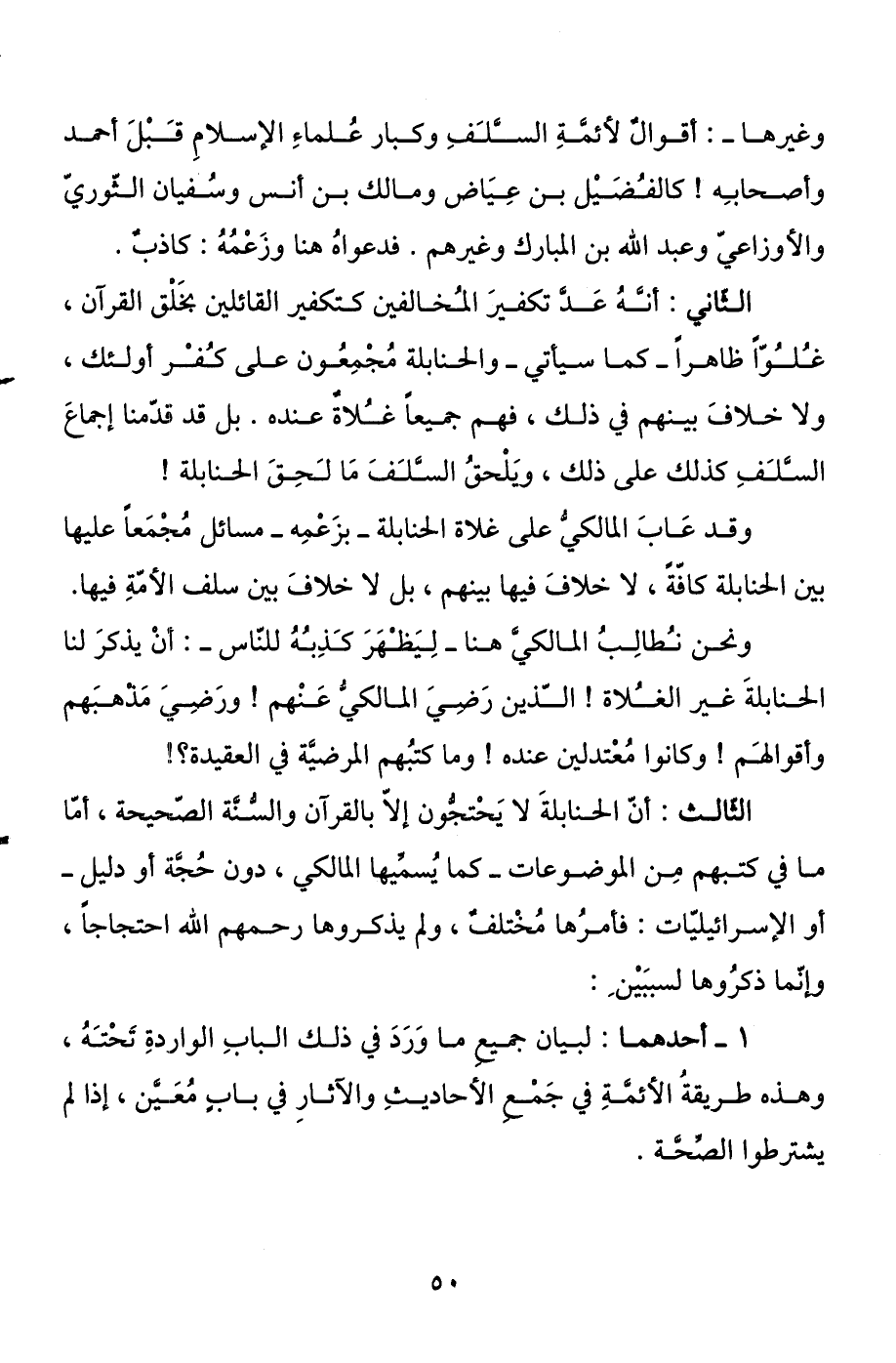 الثاني: أنه عد تكفير المخالفين كتكفير القائلين بخلق القرآن، غلوا ظاهرا - كما سيأتي - والحنابلة مجمعون على كفر أولئك، ولا خلاف بينهم في ذلك، فهم جميعا غلاة عنده. بل قد قدمنا إجماع السلف كذلك على ذلك، ويلحق السلف ما لحق الحنابلة!