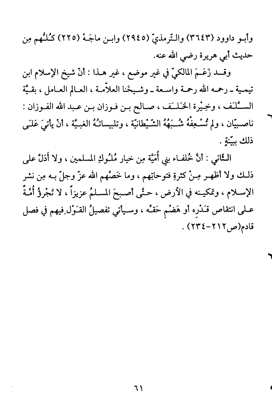 الثاني: أن خلفاء بني أمية من خيار ملوك المسلمين، ولا أدل على ذلك ولا أظهر من كثرة فتوحاتهم، وما خصهم الله - عز وجل - به من نشر الإسلام، وتمكينه في الأرض، حتى أصبح المسلم عزيزا، لا تجرؤ أمة على انتقاص قدره أو هضم حقه، وسيأتي تفصيل القول فيهم في فصل قادم (ص 212 - 234) .