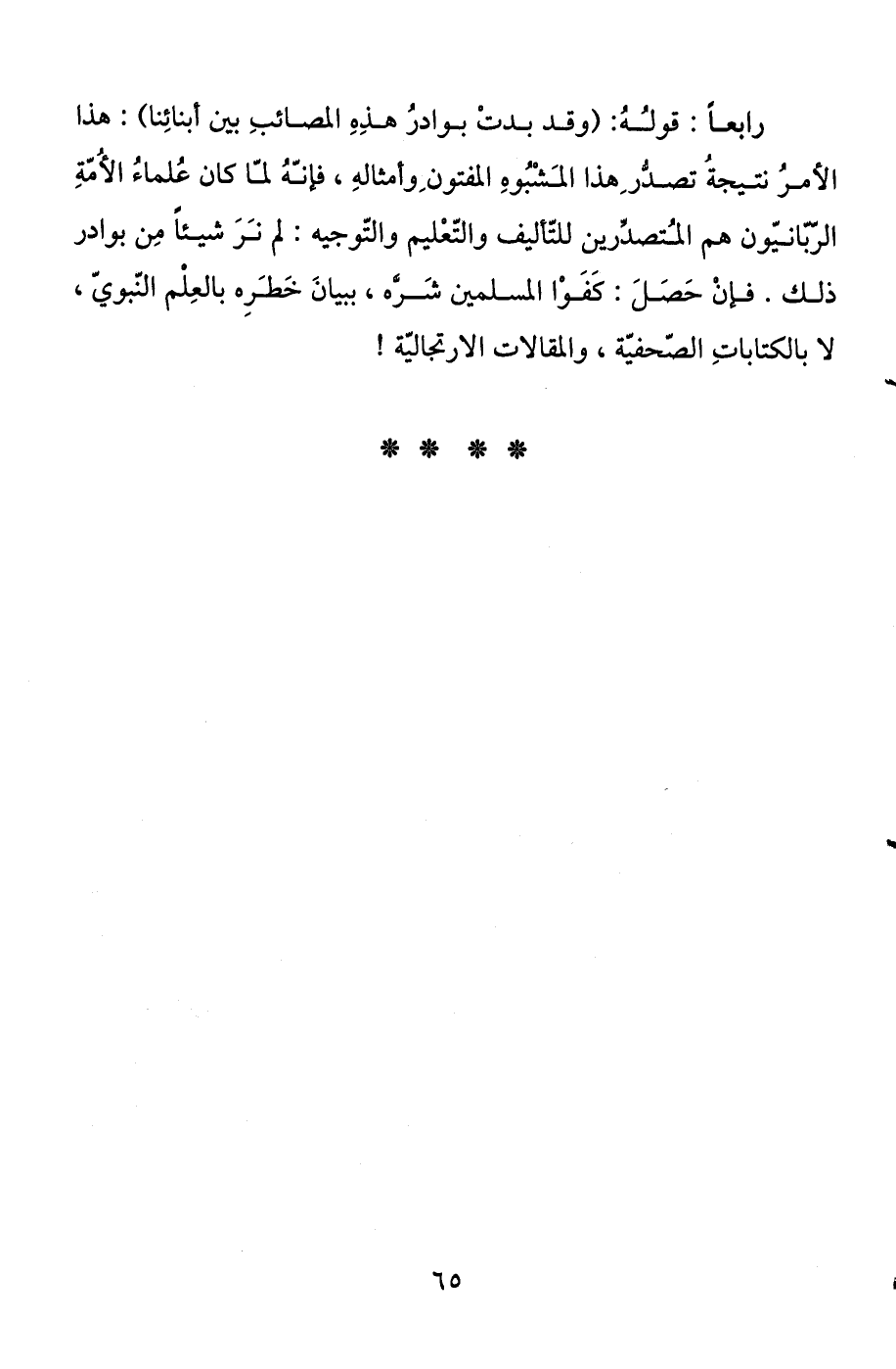 رابعا: قوله: (وقد بدت بوادر هذه المصائب بين أبنائنا) : هذا الأمر نتيجة تصدر هذا المشبوه المفتون وأمثاله، فإنه لما كان علماء الأمة الربانيون هم المتصدرين للتأليف والتعليم والتوجيه: لم نر شيئًا من بوادر ذلك. فإن حصل: كفوا المسلمين شره، ببيان خطره بالعلم النبوي، لا بالكتابات الصحفية، والمقالات الارتجالية!