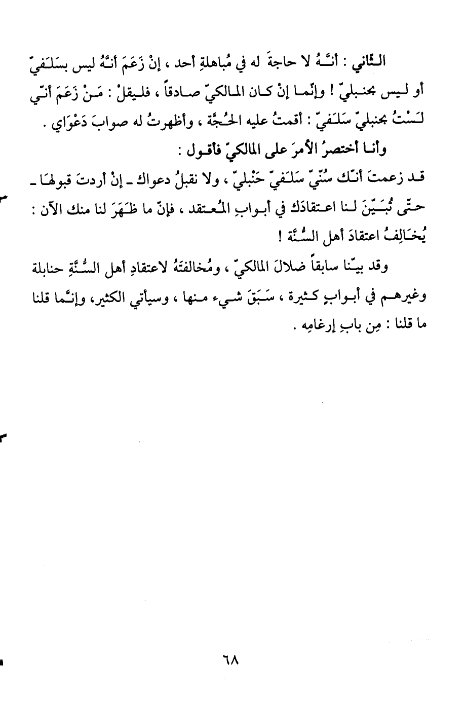 الثاني: أنه لا حاجة له في مباهلة أحد، إن زعم أنه ليس بسلفي أو ليس بحنبلي! وإنما إن كان المالكي صادقا، فليقل: من زعم أني لست بحنبلي سلفي: أقمت عليه الحجة، وأظهرت له صواب دعواي.