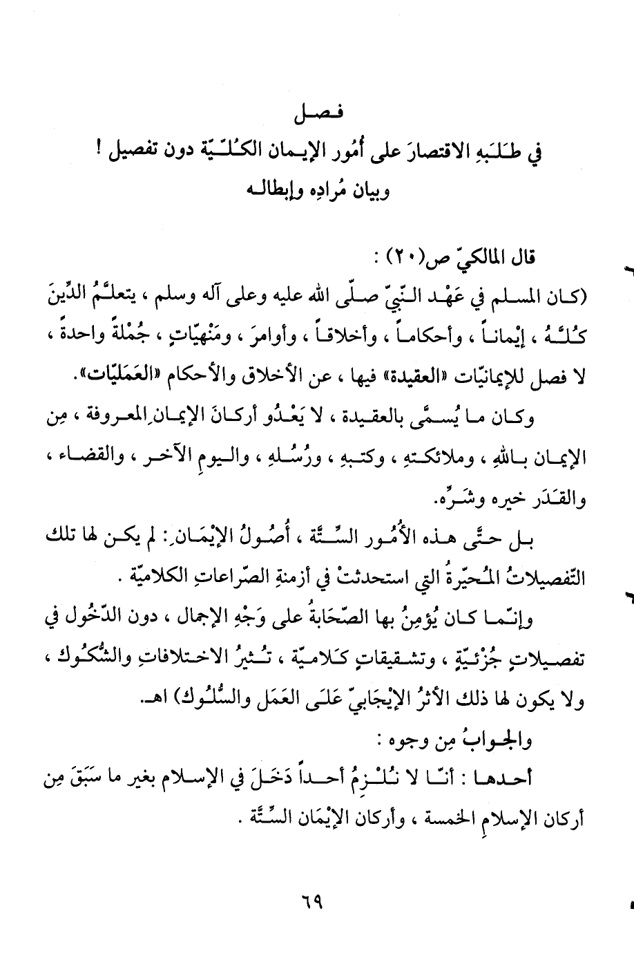 في طلبه الاقتصار على أمور الإيمان الكلية دون تفصيل! وبيان مراده وإبطاله قال المالكي ص (20) : (كان المسلم في عهد النبي صلى الله عليه وعلى آله وسلم، يتعلم الدين كله، إيمانا، وأحكاما، وأخلاقا، وأوامر، ومنهيات، جملة واحدة، لا فصل للإيمانيات "العقيدة فيها، عن الأخلاق والأحكام "العمليات ".