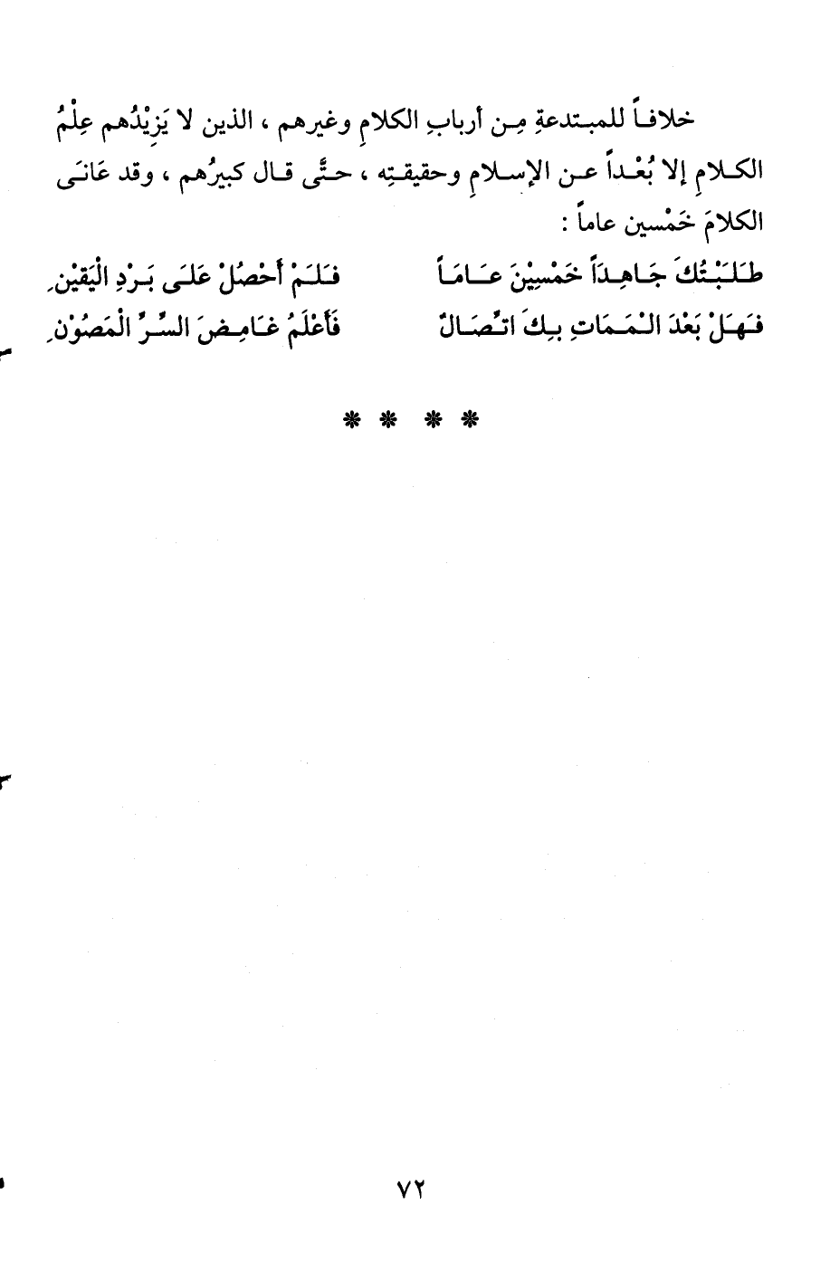 خلافا للمبتدعة من أرباب الكلام وغيرهم، الذين لا يزيدهم علم الكلام إلا بعدا عن الإسلام وحقيقته، حتى قال كبيرهم، وقد عانى الكلام خمسين عاما: