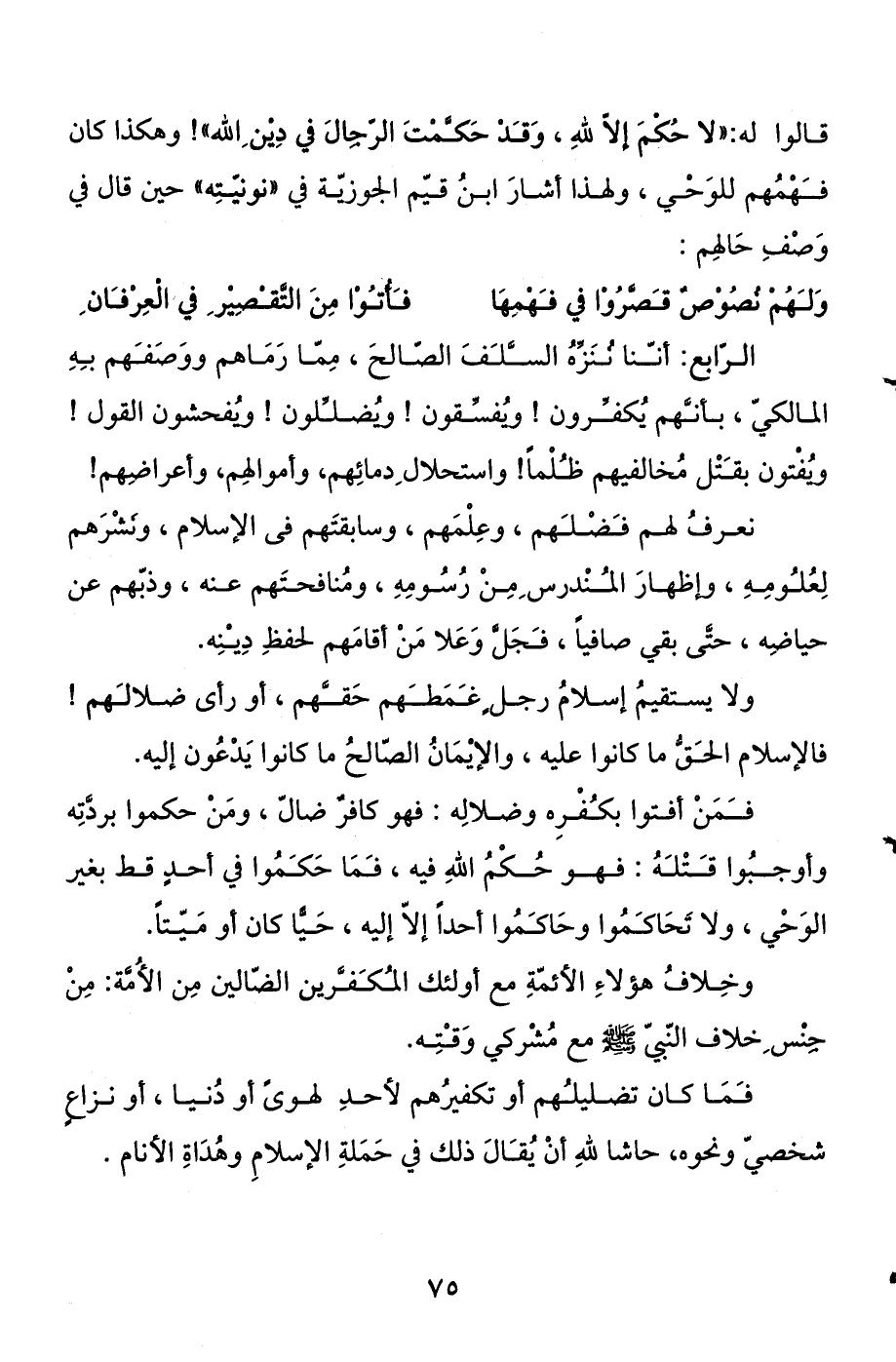 قالوا له: "لا حكم إلا لله، وقد حكمت الرجال في دين الله "! وهكذا كان فهمهم للوحي، ولهذا أشار ابن قيم الجوزية في "نونيته" حين قال في وصف حالهم:
