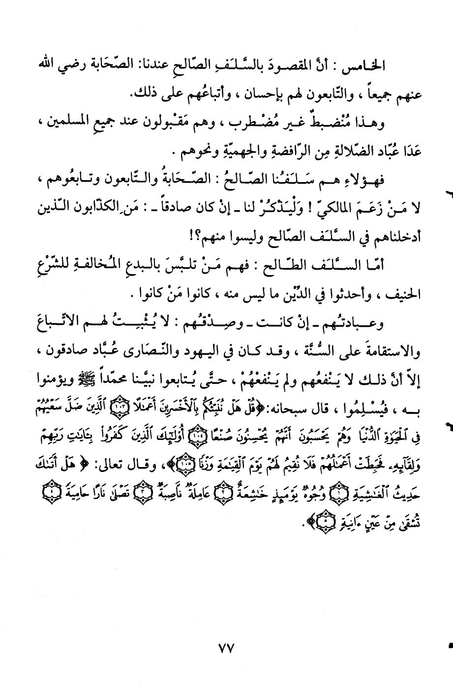 الخامس: أن المقصود بالسلف الصالح عندنا: الصحابة رضي الله عنهم جميعا، والتابعون لهم بإحسان، وأتباعهم على ذلك.