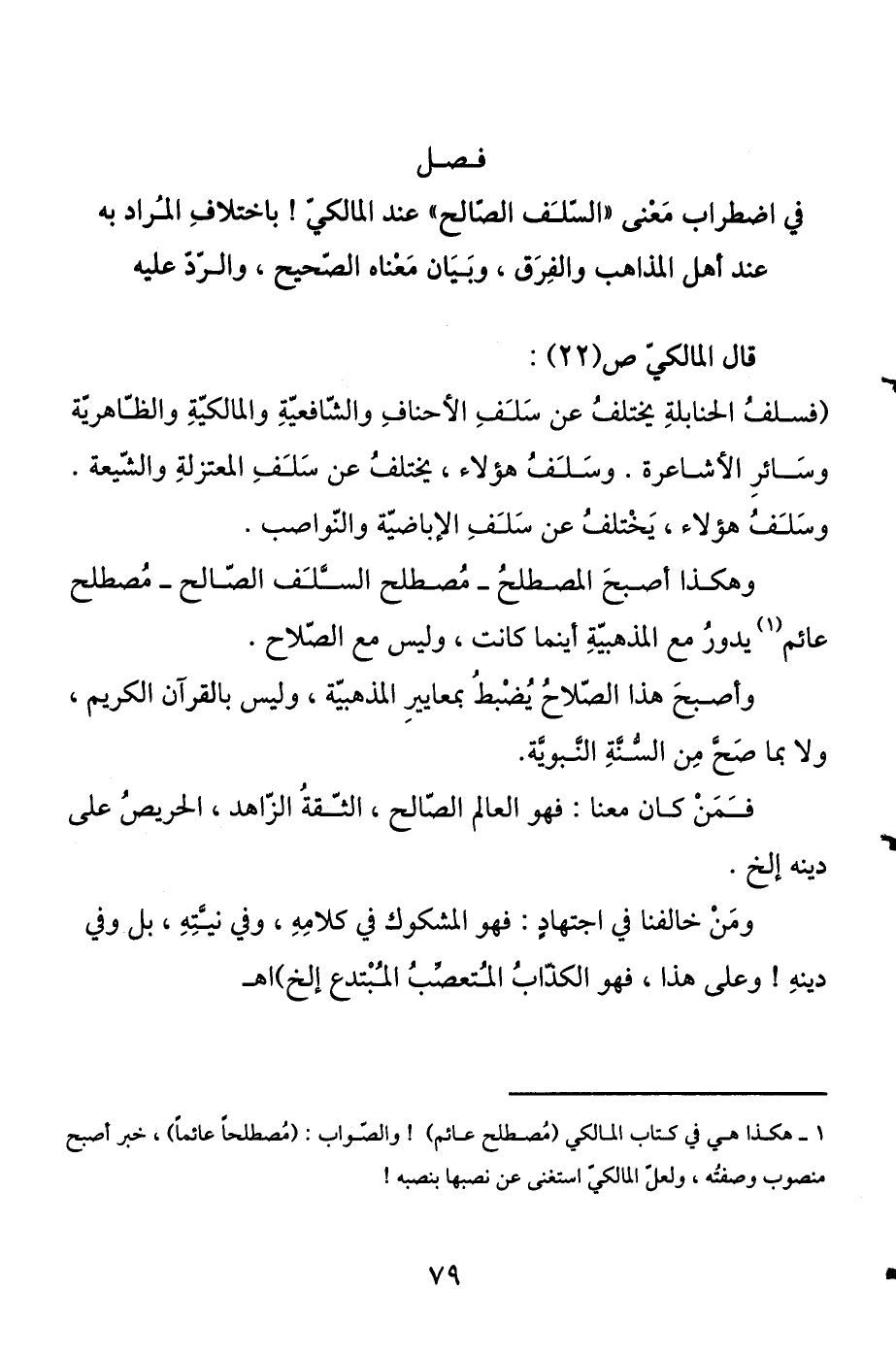 وبيان معناه الصحيح، والرد عليه قال المالكي ص (22) : (فسلف الحنابلة يختلف عن سلف الأحناف والشافعية والمالكية والظاهرية وسائر الأشاعرة. وسلف هؤلاء، يختلف عن سلف المعتزلة والشيعة. وسلف هؤلاء، يختلف عن سلف الإباضية والنواصب.