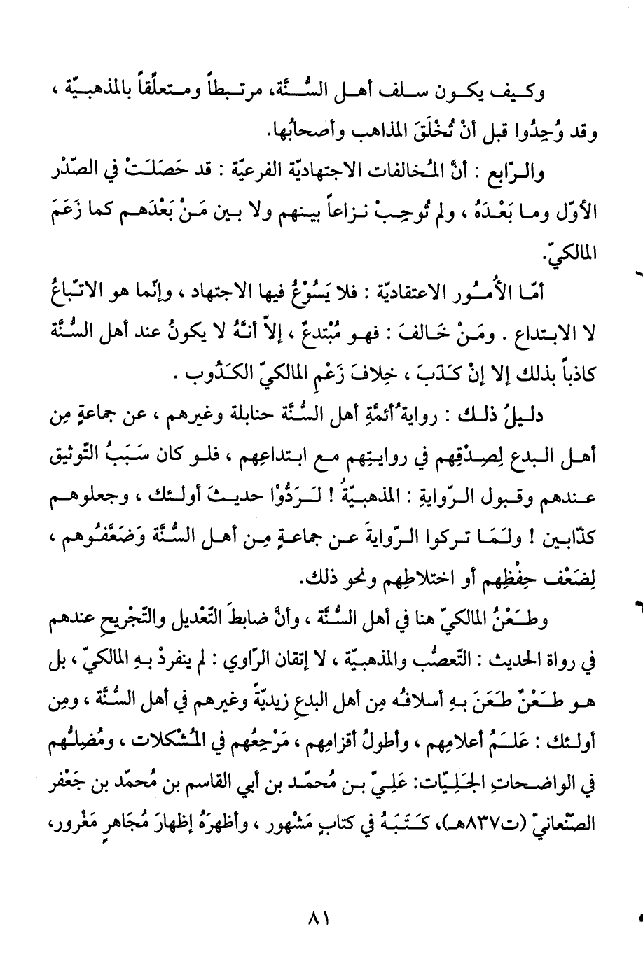 وطعن المالكي هنا في أهل السنة، وأن ضابط التعديل والتجريح عندهم في رواة الحديث: التعصب والمذهبية، لا إتقان الراوي: لم ينفرد به المالكي، بل هو طعن طعن به أسلافه من أهل البدع زيدية وغيرهم في أهل السنة، ومن أولئك: علم أعلامهم، وأطول أقزامهم، مرجعهم في المشكلات، ومضلهم في الواضحات الجليات: علي بن محمد بن أبي القاسم بن محمد بن جعفر الصنعاني (ت 837 هـ) ، كتبه في كتاب مشهور، وأظهره إظهار مجاهر مغرور،