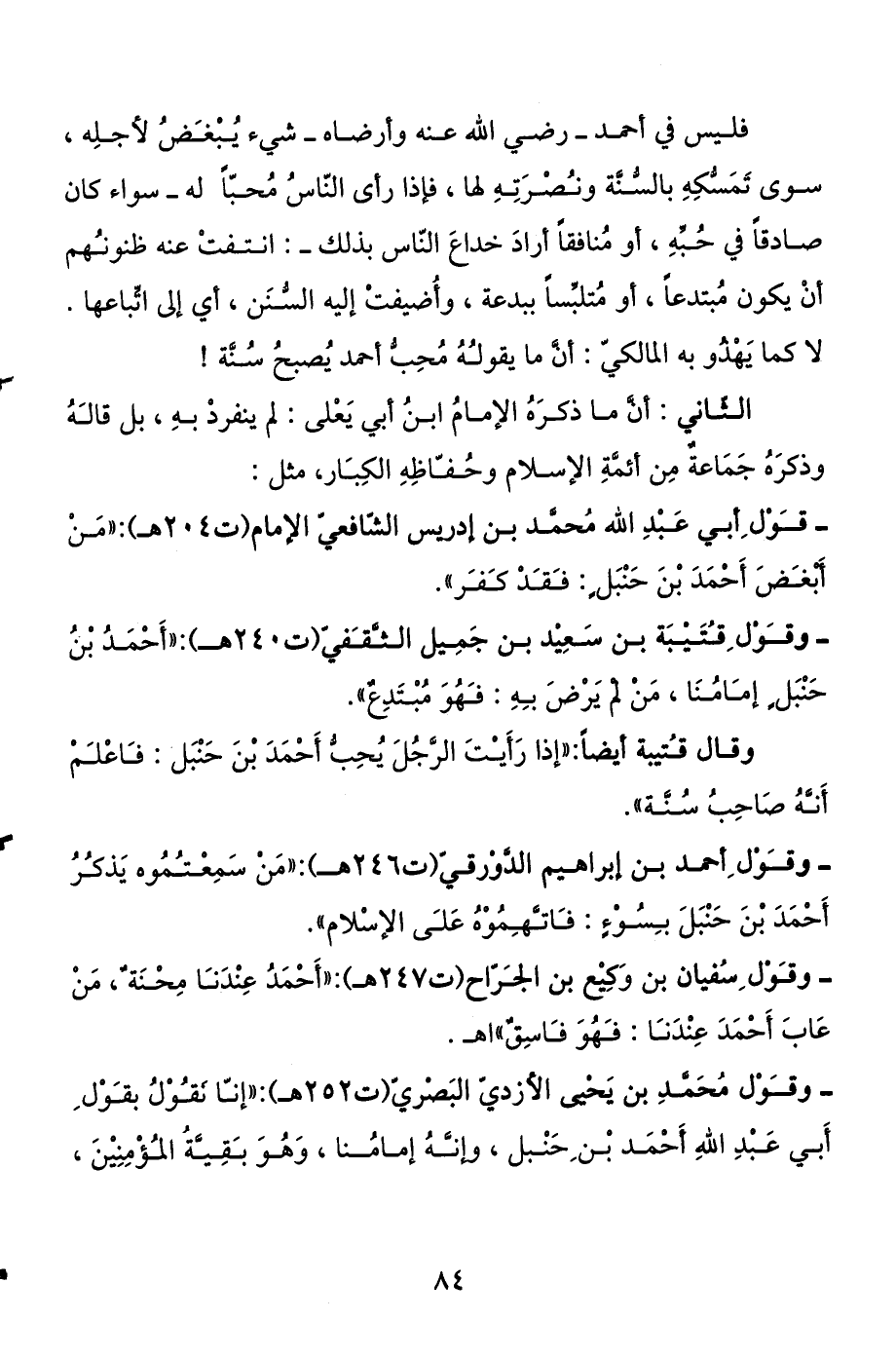 فليس في أحمد -رضي الله عنه وأرضاه- شيء يبغض لأجله، سوى تمسكه بالسنة ونصرته لها، فإذا رأى الناس محبا له -سواء كان صادقا في حبه، أو منافقا أراد خداع الناس بذلك-: انتفت عنه ظنونهم أن يكون مبتدعا، أو متلبسا ببدعة، وأضيفت إليه السنن، أي إلى اتباعها. لا كما يهذو به المالكي: أن ما يقوله محب أحمد يصبح سنة!