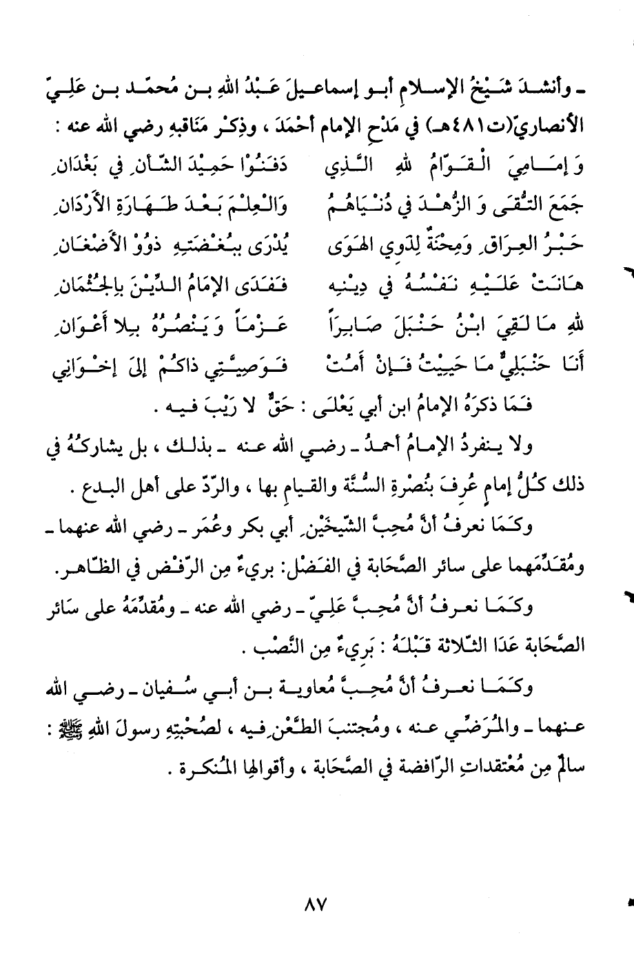- وأنشد شيخ الإسلام أبو إسماعيل عبد الله بن محمد بن علي الأنصاري (ت 481 هـ) في مدح الإمام أحمد، وذكر مناقبه رضي الله عنه:
